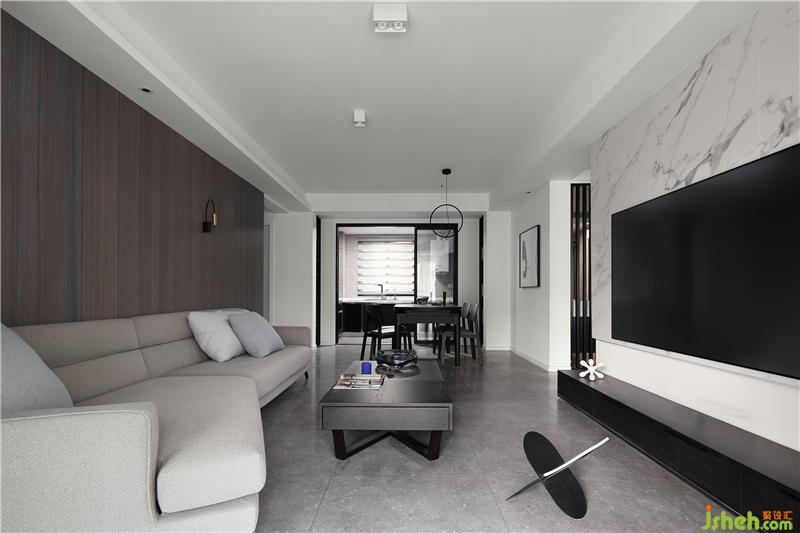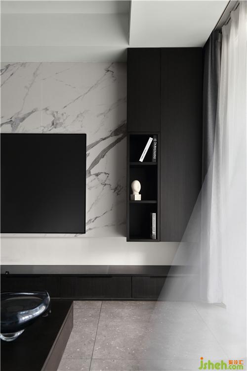 客厅电视背景墙采用白色纹理大理石,沙发背景采用深咖色饰面板,空间感,高级质感来自于颜色和材质的结合运用。