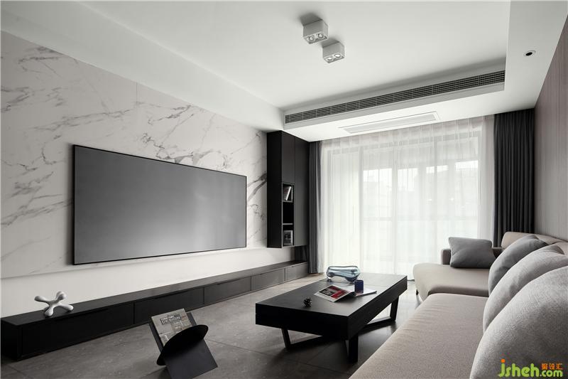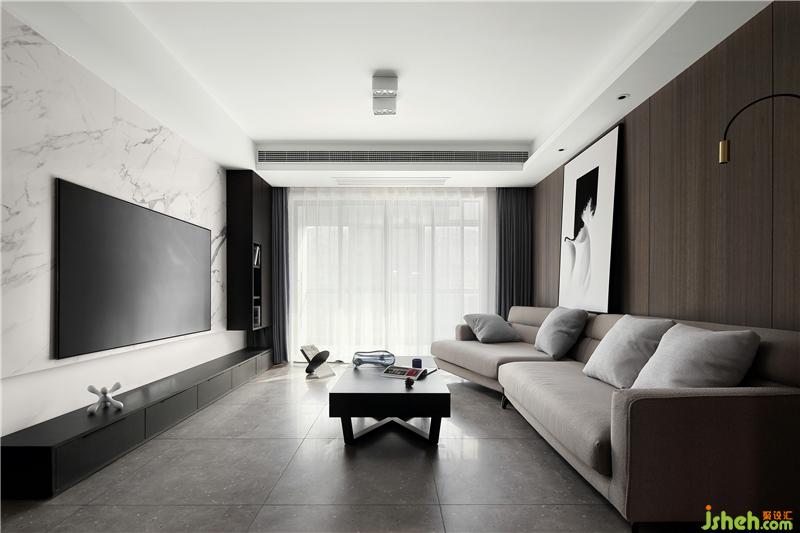 The living room TV background wall adopts white texture marble, and the sofa background adopts dark coffee color decorative panel. The sense of space and advanced texture come from the combination of color and material.