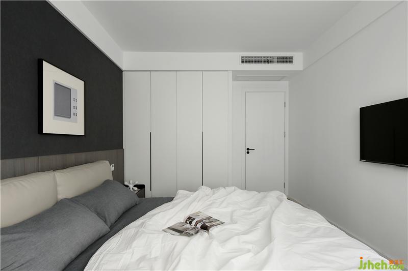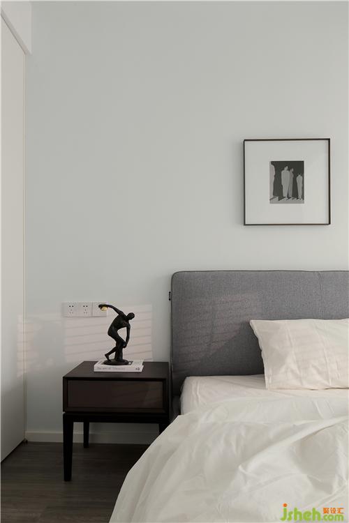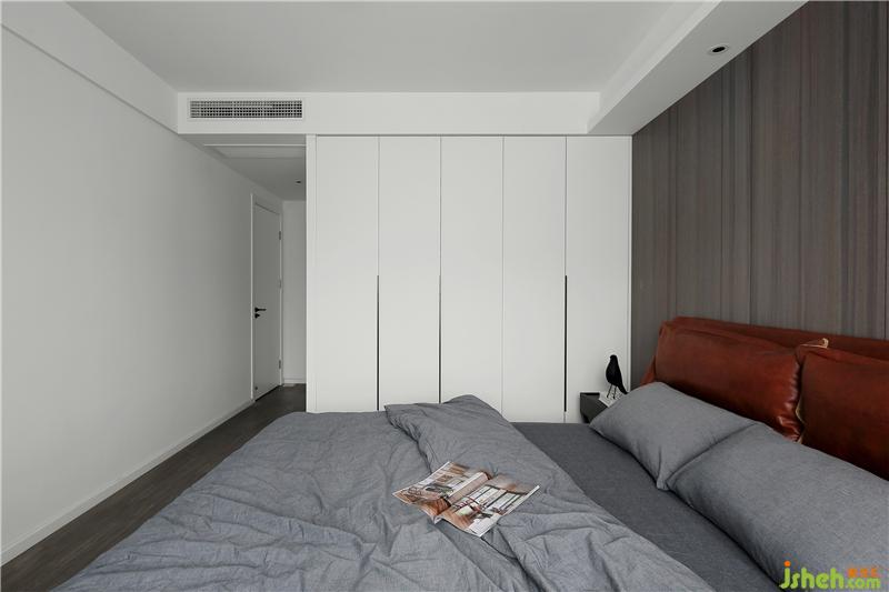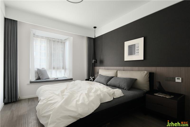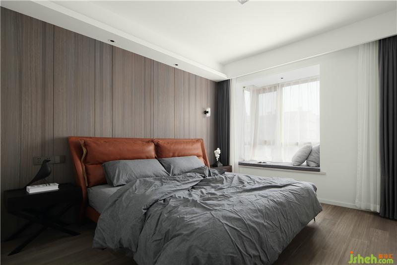 Deep coffee color bed headdress panel, with leather sofa, temperament completely set off, let people feel comfortable, very layered.