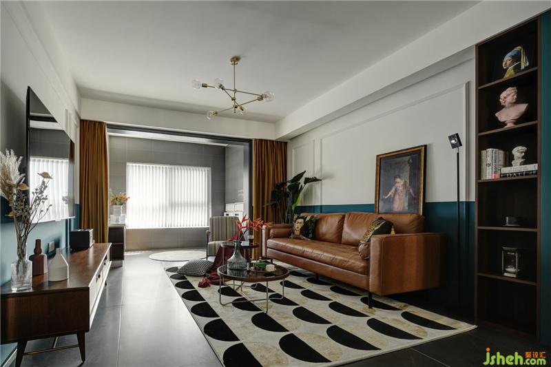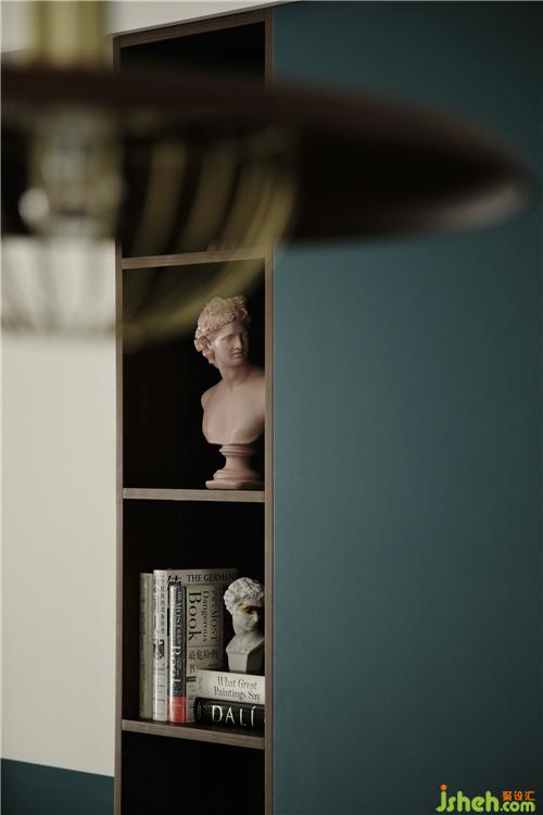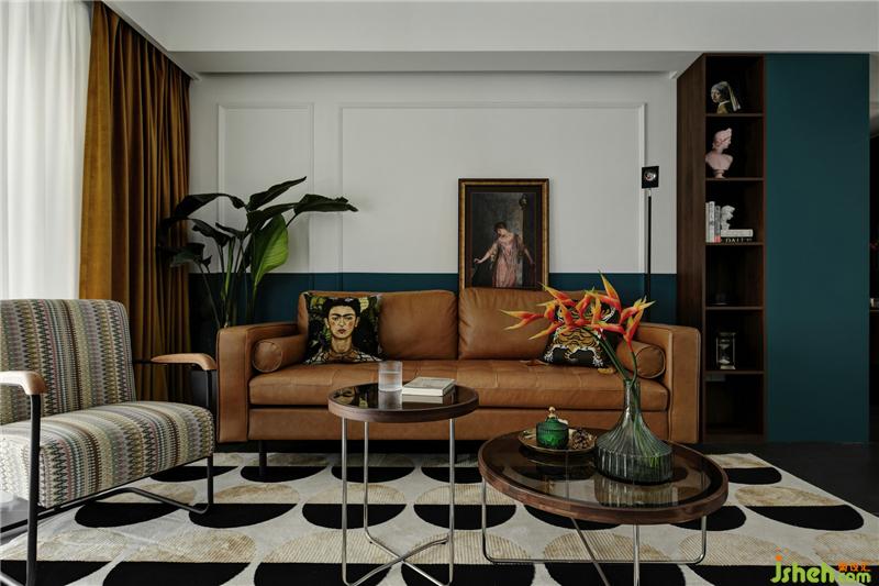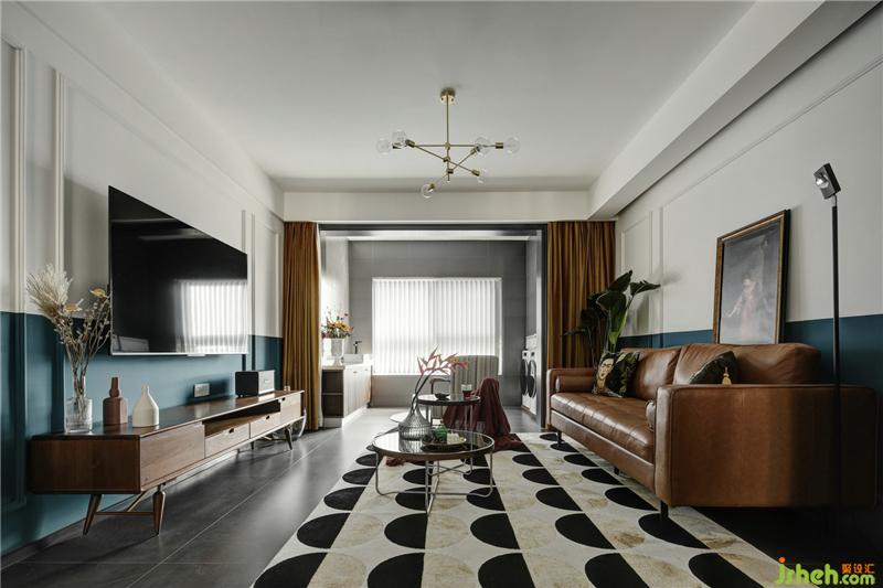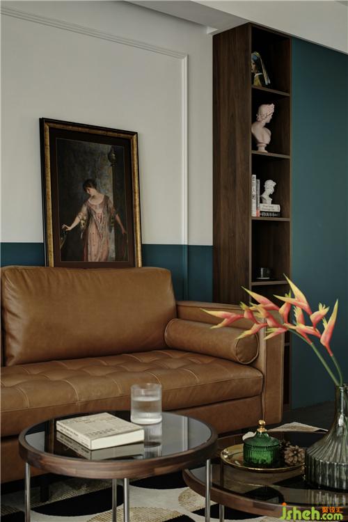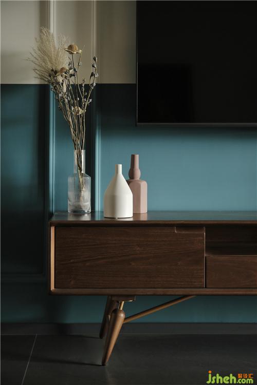 客厅迎面而来复古气息,可以瞬间让人放松下来,墙面以孔雀蓝为跳色,并做了拼色墙,运用石膏线条的点缀,不仅丰富墙面层次,也是复古元素的呈现南京装修设计。