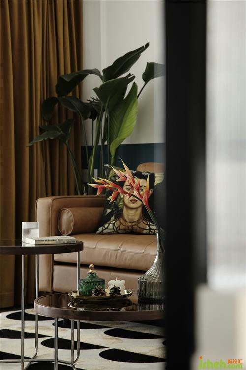 Brown leather sofa, with retro pillows, everything is in order. The big green plants give the space a natural flavor. Every element is surrounded by life and has its own emotional symbol. Life is always sunny.