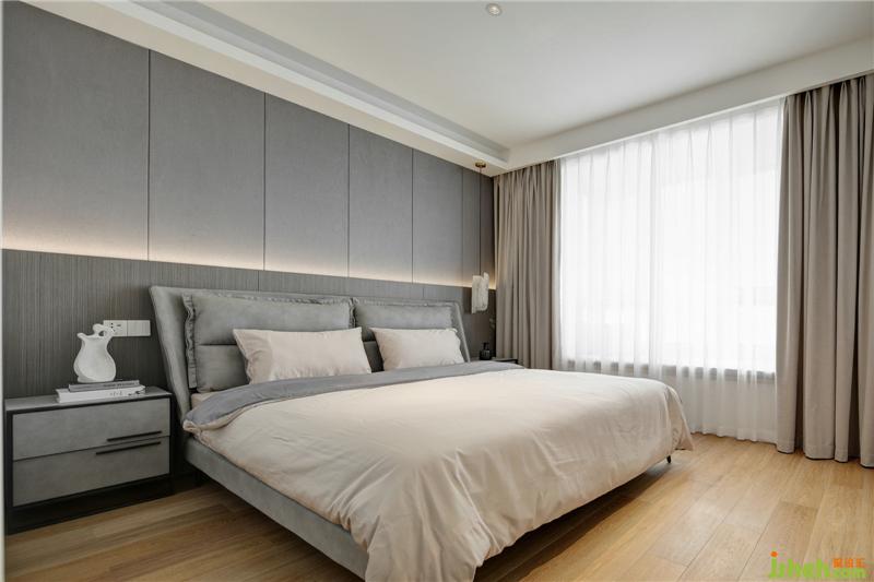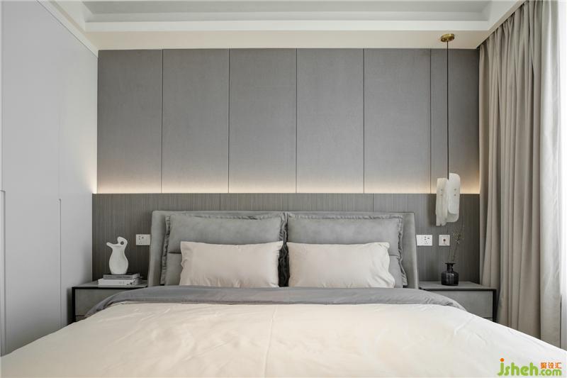 床头背景墙暗藏灯带,丰富床头的层次,也给父母营造时尚高级感。