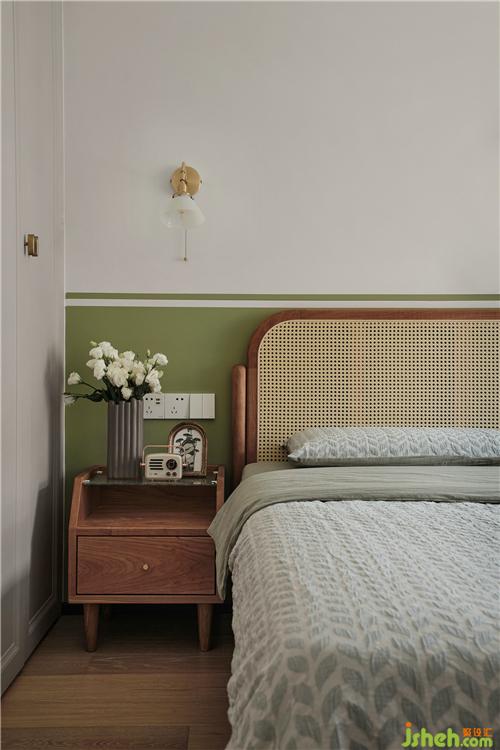 主卧,延续绿色主题,绿白拼色墙清新自然,给父母一个明亮和煦的休息空间。