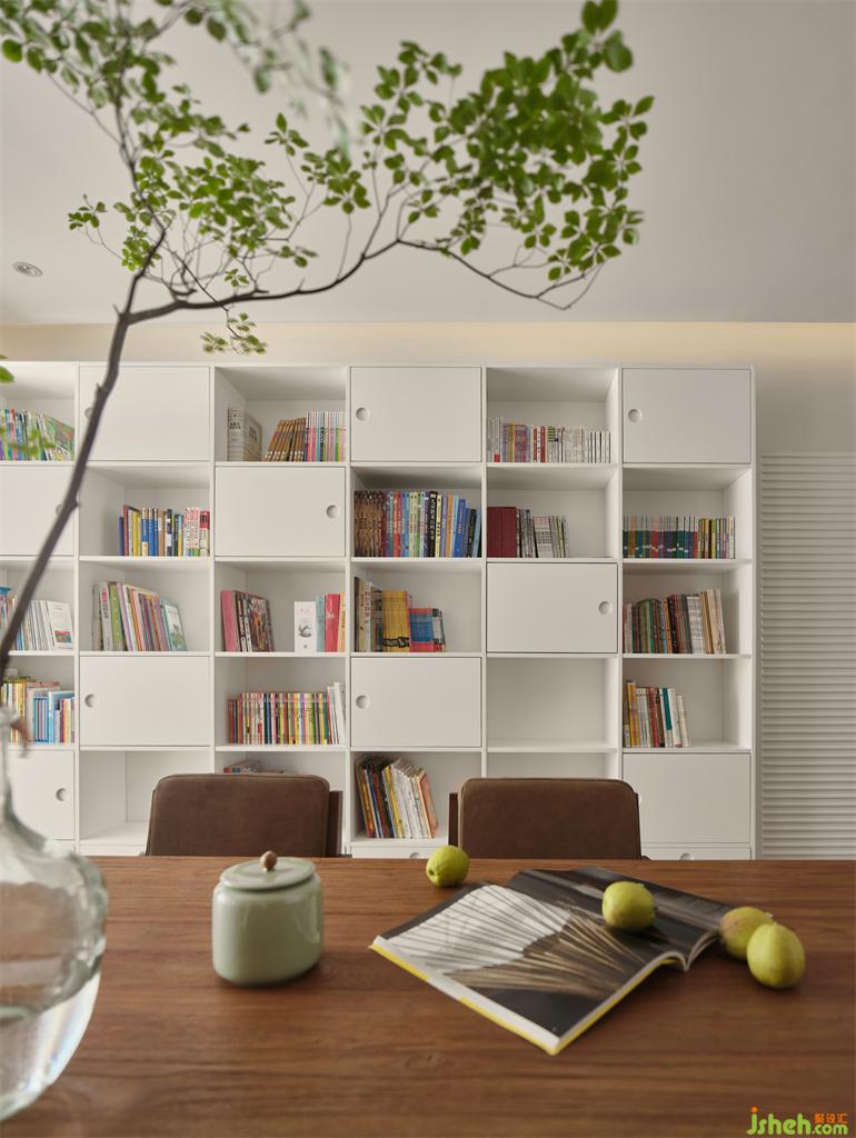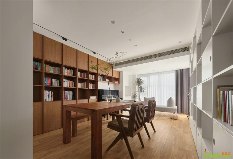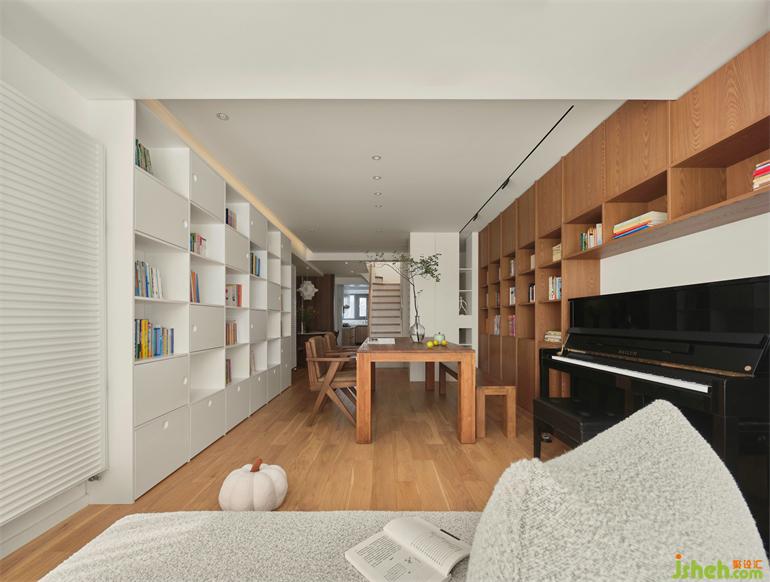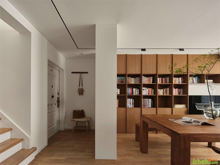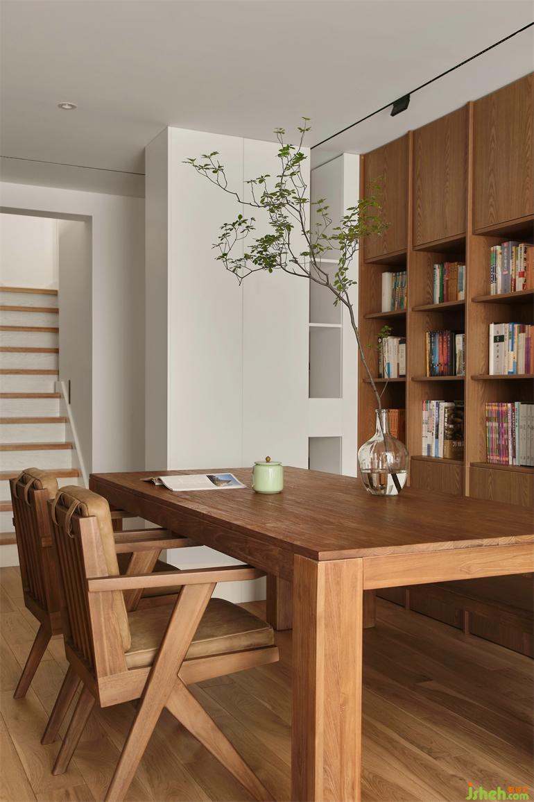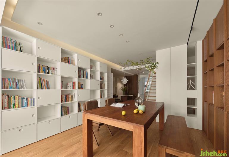 家庭图书室书架两边满墙设计书柜,一面木色,一面白色,一面规整,一面无序,两边书柜的不同设计,复式装修设计减弱空间带来的压抑感,白色延伸感和通透,原木质朴。