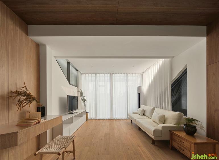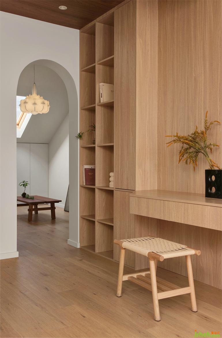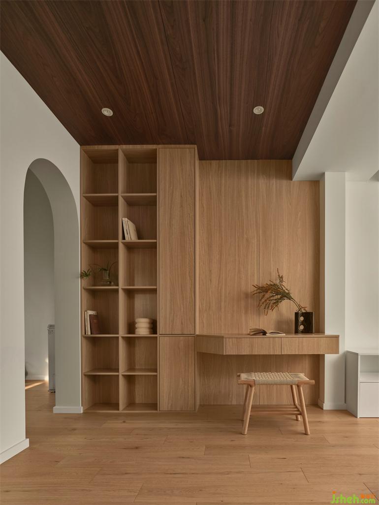 二楼原有露台改为客厅,顶部木饰面和墙面木饰面形成方形造景框,复式装修设计划分出单独的书桌办公空间,客厅保留了露台的部分原始架构,顶部吊顶隔热,空间相对无序,没有边界,自由而舒适。
