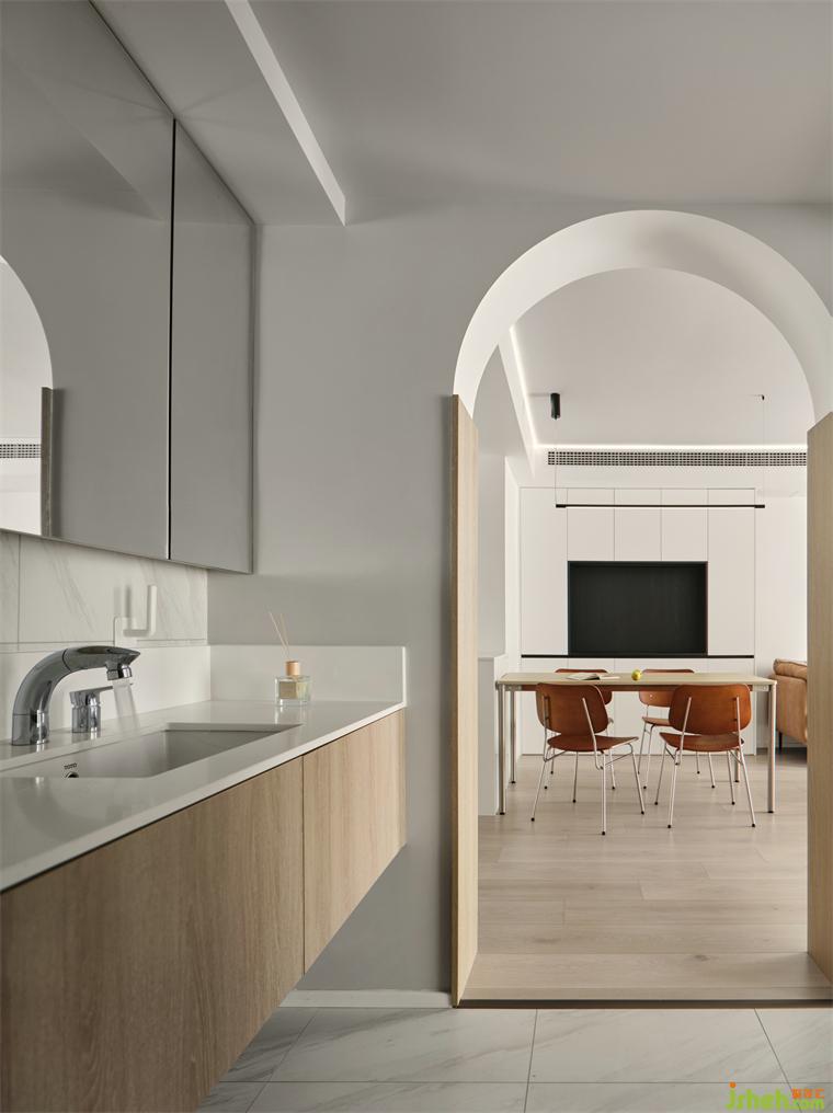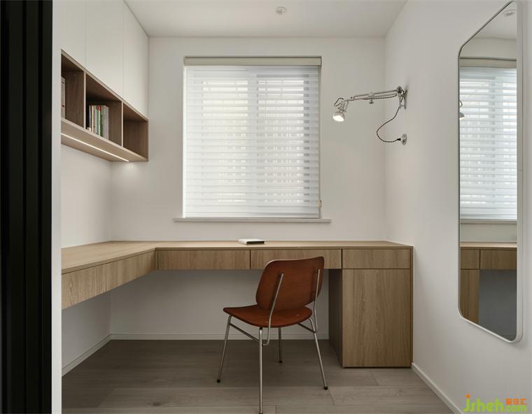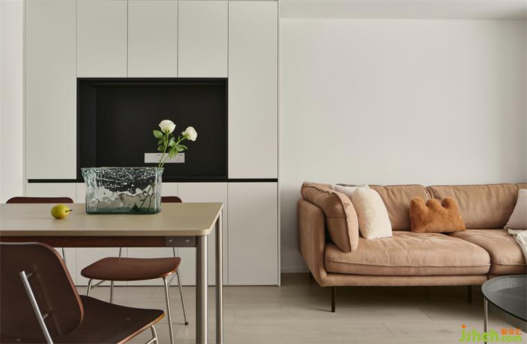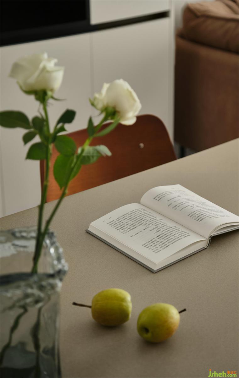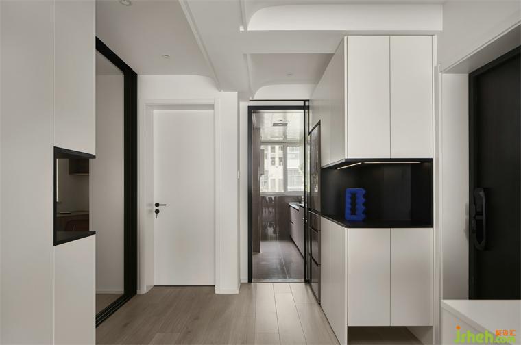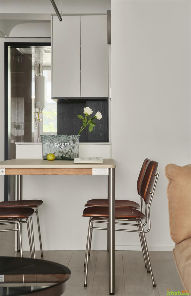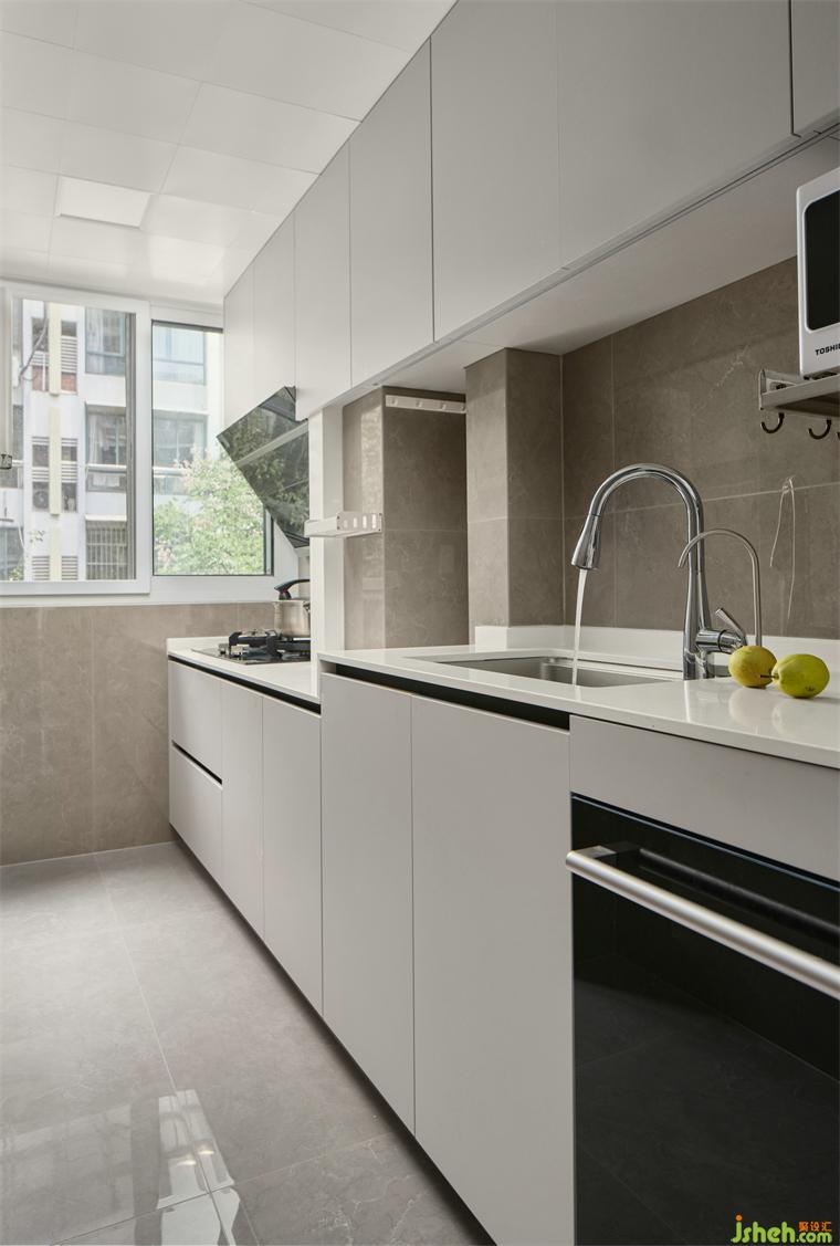 厨房台面根据业主身高做了高低落差,厨房由择菜、洗菜、切菜、炒菜、承盘这几部分组成,室内设计师不同的功能从舒适角度上看对于高度的需求不同