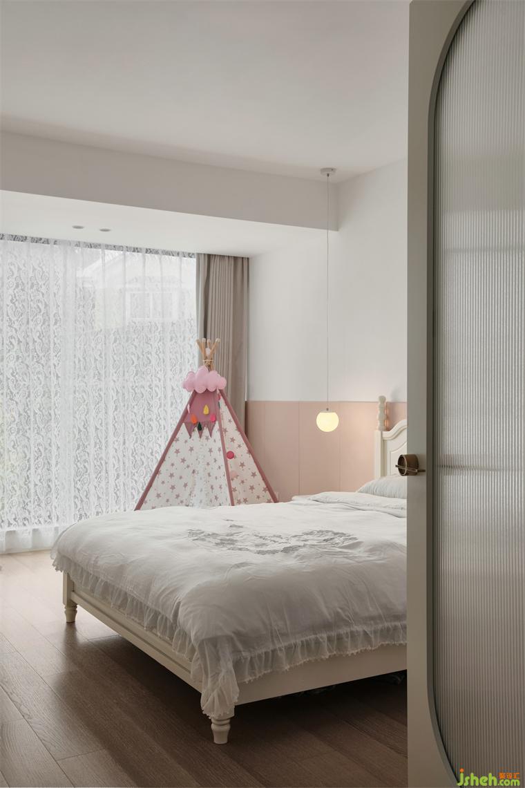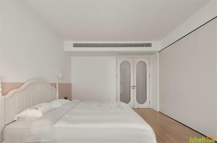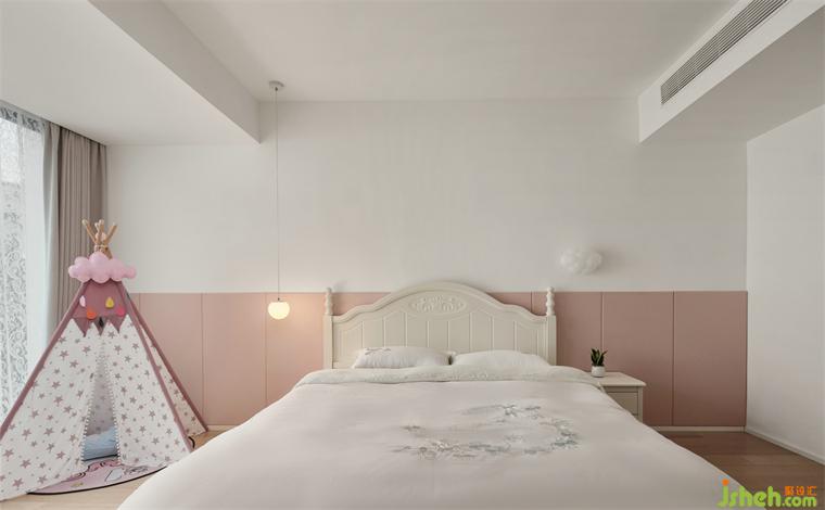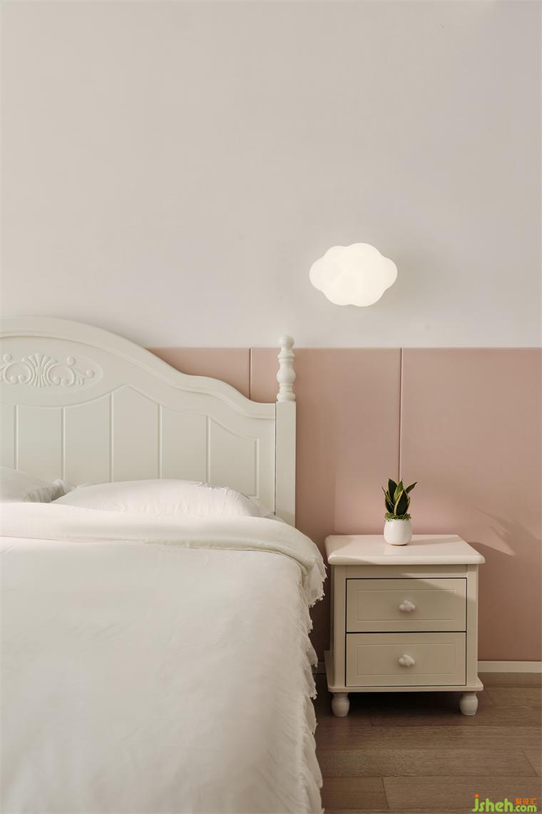 粉色拼色墙装饰,让床头背景流露层次感,叠墅装修设计浪漫而温馨。