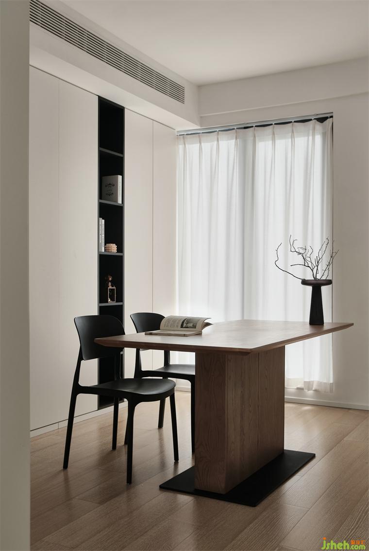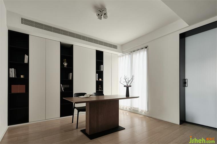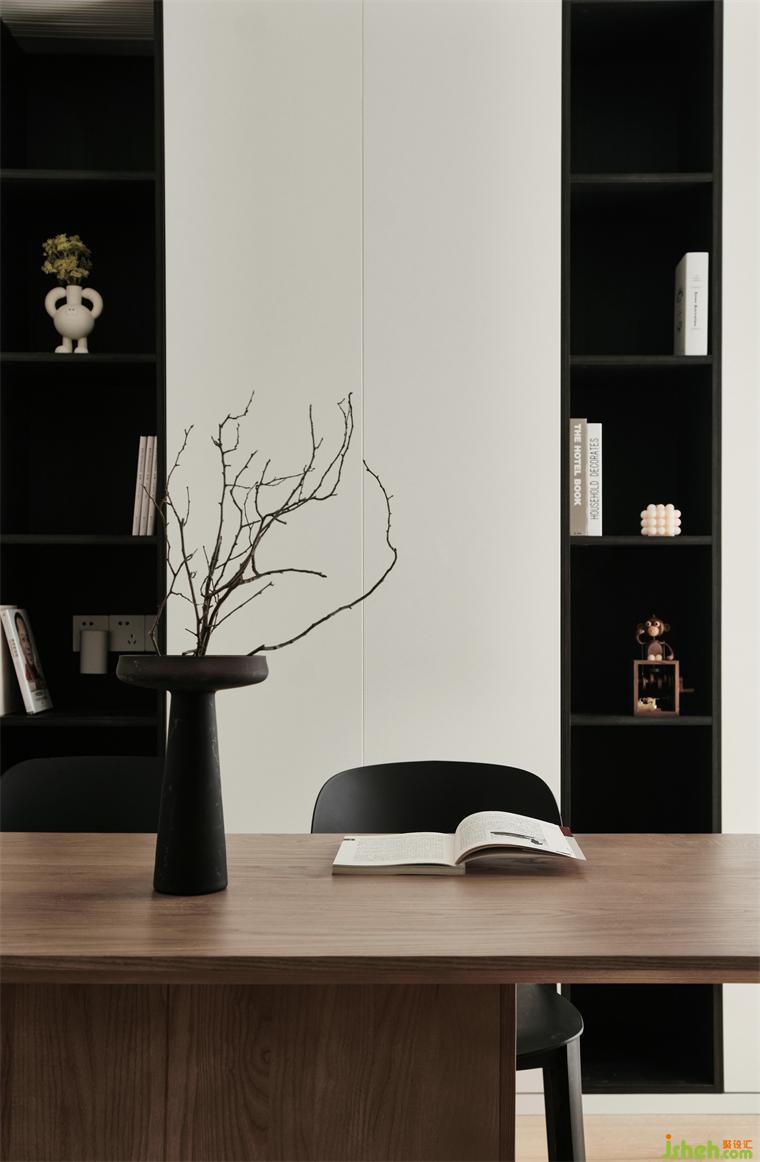 二楼书房区域,设计了一整面书柜,开放式与封闭式相结合,叠墅装修设计用于摆放书籍和艺术摆件,一张实木书桌方便日常办公。