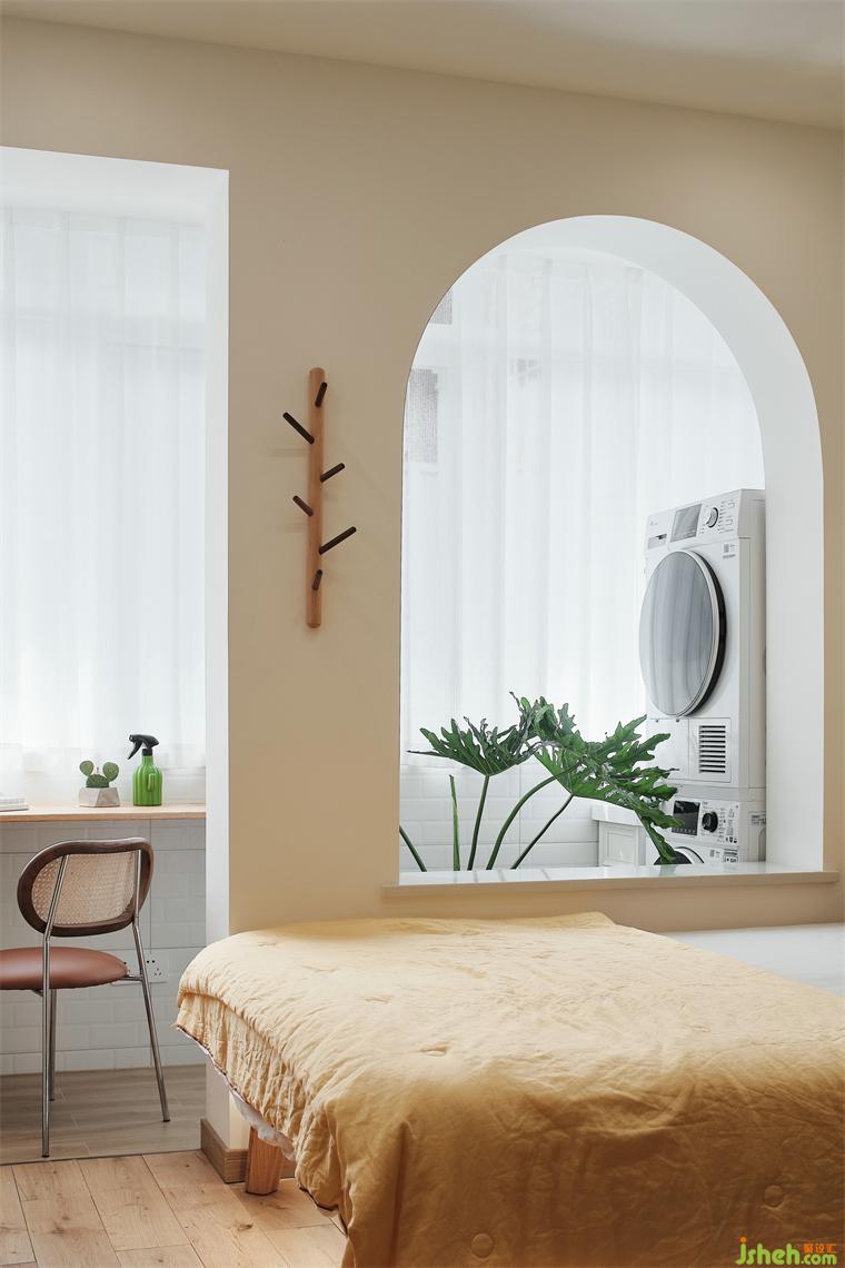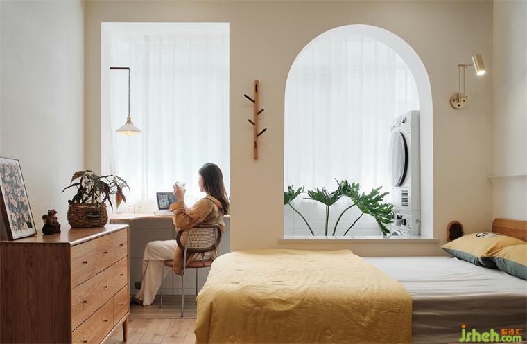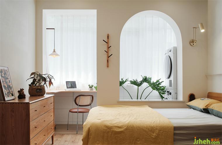 阳台并入卧室,取消原来的窗户,用弧形窗洞做成隔而不断的效果,也增多卧室内部的光线。