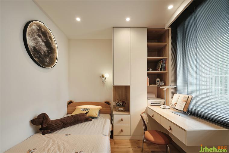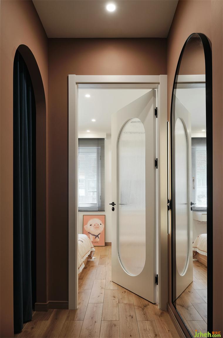 两间次卧改造成衣帽间和儿童房,蓝色门帘后是储物式衣帽间,装修公司对面是一面全身镜,镜子还能显大空间。