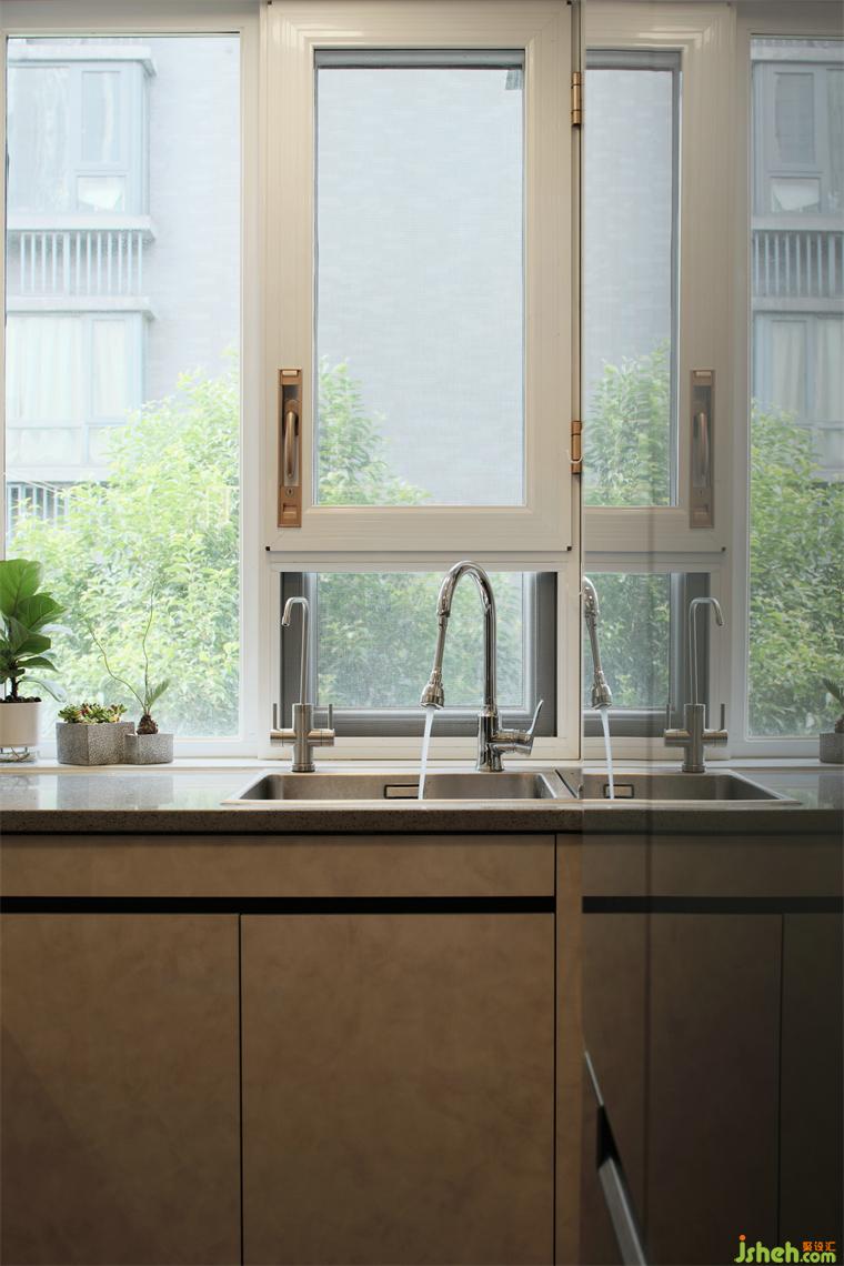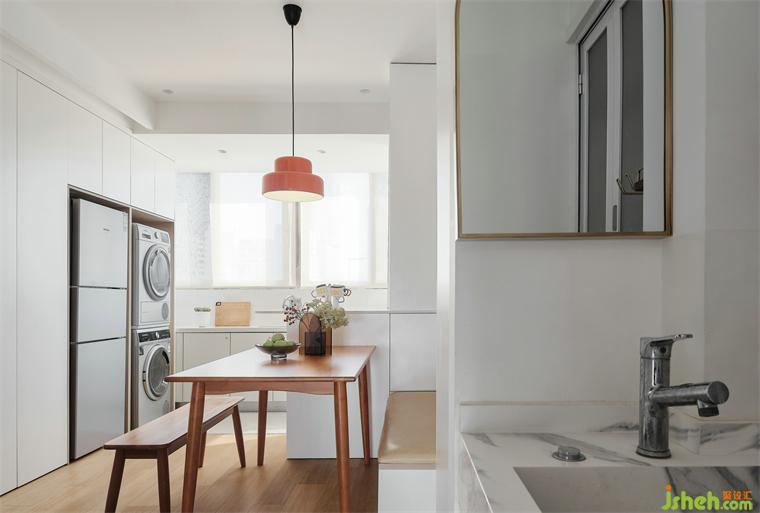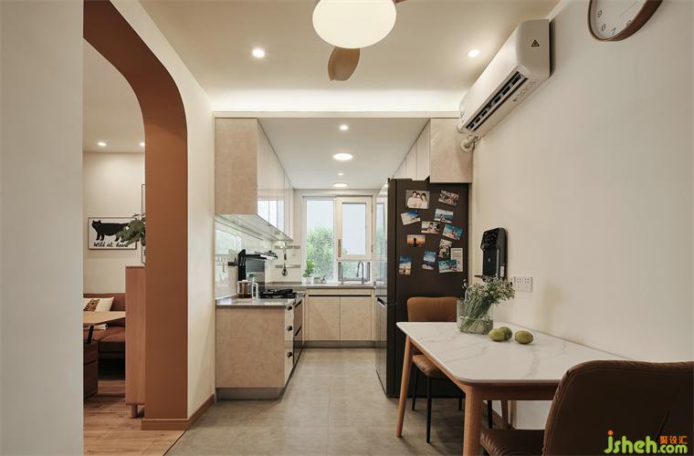 开放式厨餐厅,让空间显开阔,同时也便于家人互动,妈妈在厨房准备食物的时候,也能看到在公共区活动的孩子。