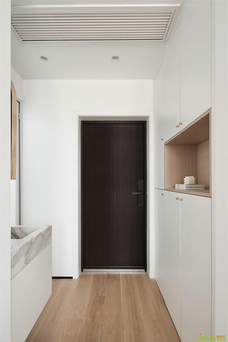 入户玄关,顶天立地一整面鞋柜,可以摆放一家人的鞋子,中间预留开放区,装修公司可以随手放钥匙包包等小物件。