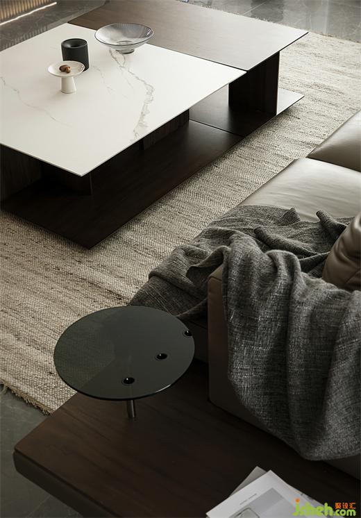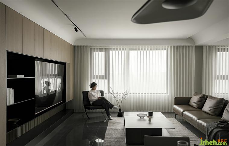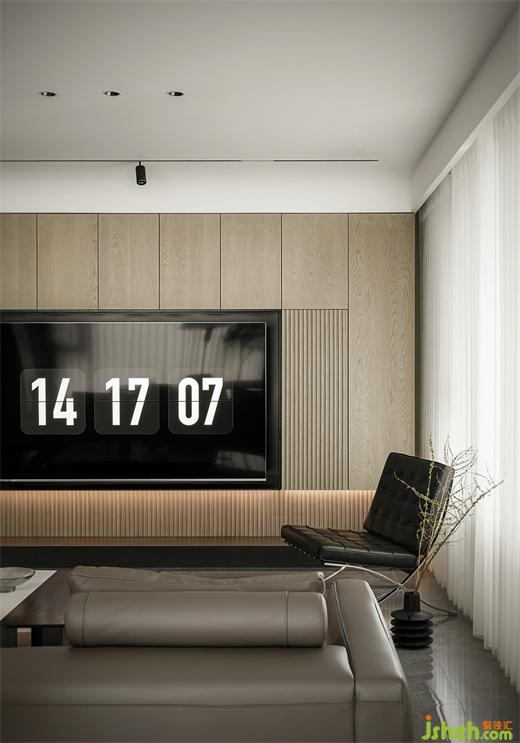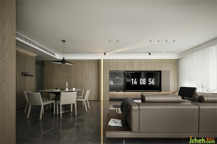 低调质朴,通过线条、体块、解构,整合使空间简洁化,保证最大使用功能的前提下,南京大平层装修设计以明快、质感、大气的形式进行表现。由于业主比较喜欢亮面砖,客厅地面选用有质感的深色仿大理石瓷砖,墙面原木色柜体局部黑色内嵌石材给人以厚重优雅的高级感。