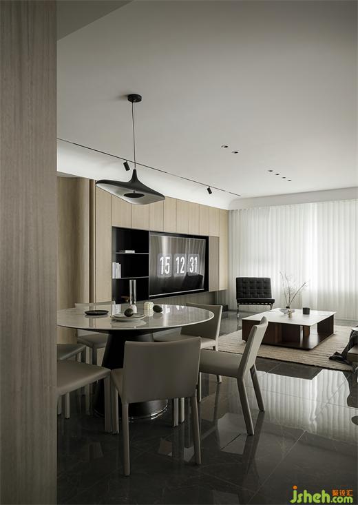 空间设计的“整”体性,圆弧转角设计延伸两面墙为一个整体,做了隐形双开门,整个客厅和餐厅化碎为整,连贯相通,两个卧室隐藏于后。