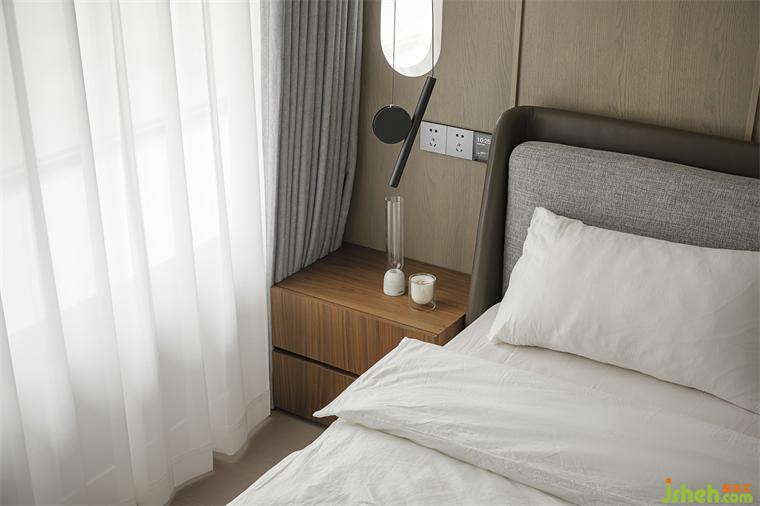 入门处设计了整排收纳,卫生间采用电动雾化玻璃时尚又解决采光问题。南京大平层装修设计床头处卫生间墙体内推做了“s”弯设计,留有床头收纳柜,方便老人随手放置必要的物品。