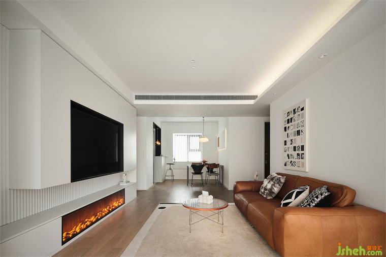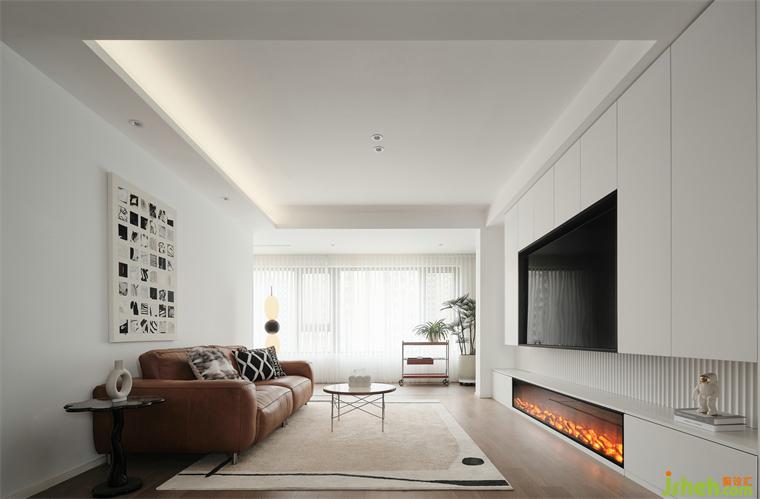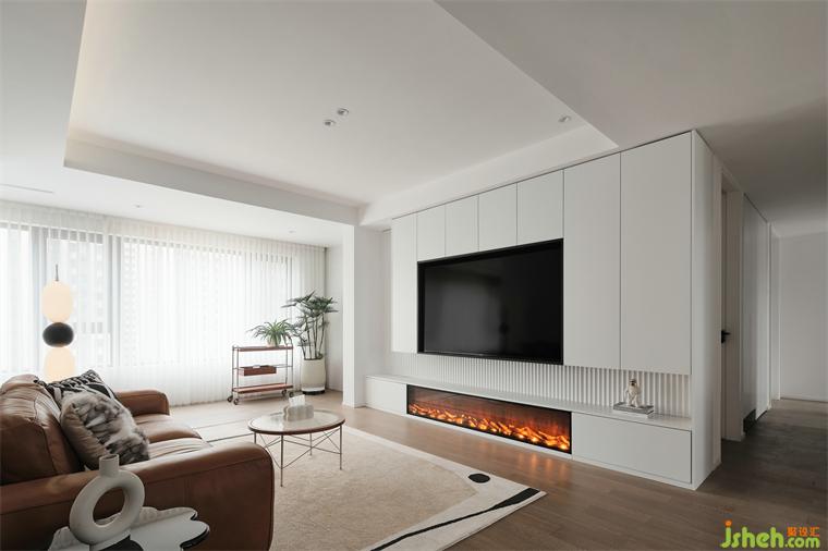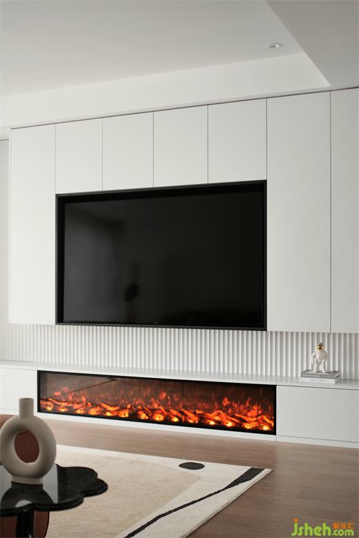客厅收纳,多功能收纳式电视背景墙。上方为收纳柜电视嵌入其中,下方底层安装壁炉式火焰加湿器;清新空气,又为家居增添艺术气息,成为家中一道风景。