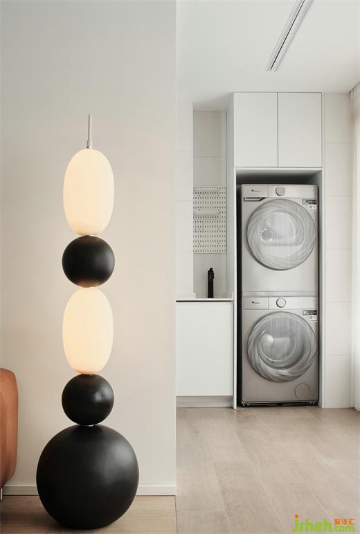 阳台一角做家政区,洗衣机烘干机叠放省空间,吊柜存放家居用品;一角还留有手洗区,顶部为隐藏式晾衣架,小小空间解决洗烘晒所有功能。