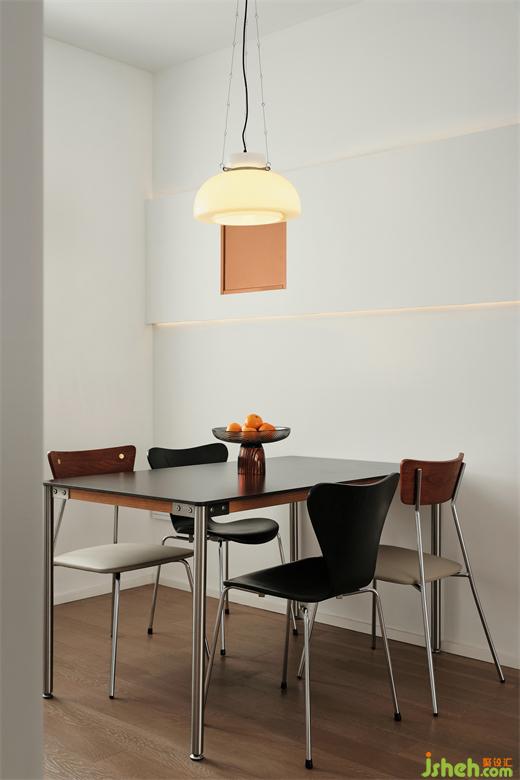 软装上也把握小动作的手法,吊灯,精装房改造不同颜色形状的餐椅、餐桌上方个性造型和氛围灯,简单却有个性的氛围感。