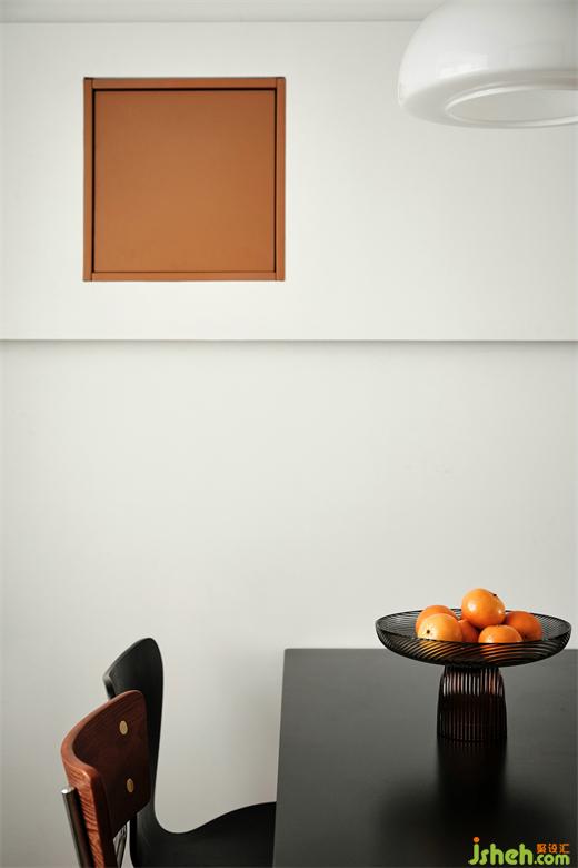 橘色小方框不单是点缀,这是家中电箱的位置,墙面加入局部基层做出方形盖板,精装房改造内置反弹器可以自由开关方便检查。四周嵌入灯带为餐厅增加氛围感。
