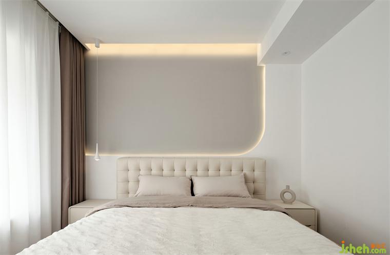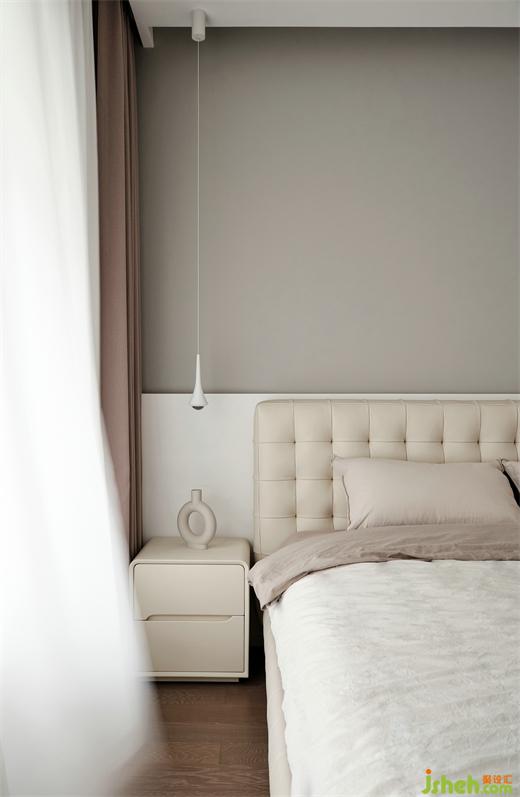 主卧出色的床头设计为整个房间锦上添花。卧室适度的暖色调,精装房改造柔美又利落的线条,一盏精致的吊灯,整体空间显得浪漫又宁静舒适。