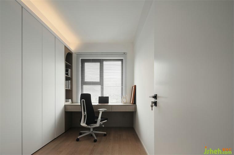 书房原始布局零碎,空间暗小;拆除后扩大空间。精装房改造书房靠窗位置设计悬浮式书桌可容纳夫妻二人共同办公,还设计了一角书架,可以摆放文具书籍。