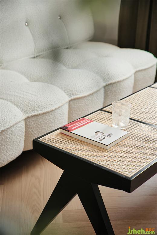 俏皮造型布艺沙发、藤编茶几,拼接木色地板,装修公司精致是细节之美。