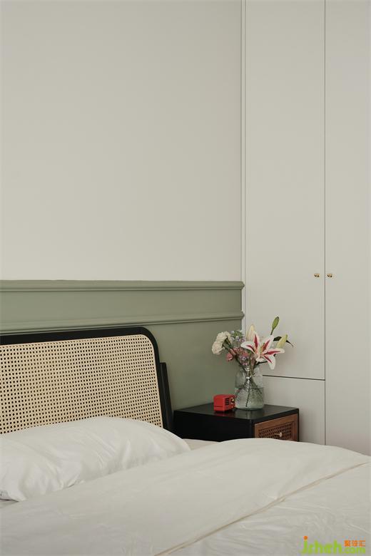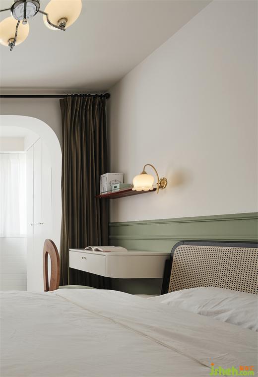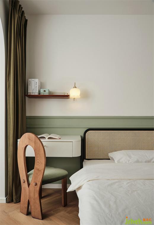 卧室,告别传统床头柜,根据设计定制了这样一款悬浮柜,装修公司可做女主化妆台,柜角处还贴心做了弧角,防止磕碰。