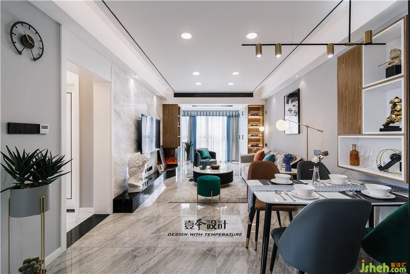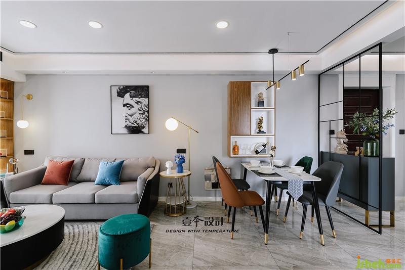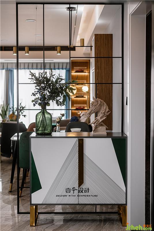 ▲玄关处一面黑色不锈钢隔断很好的分割了入户玄关与客餐厅两个区域。一款拼色的玄关柜撑起了整个空间的格调,时尚简约的造型,黑色烤漆的台面,金色的柜腿设计,将形式上的意与美结合,时尚又不缺乏质感。柜子上随意摆放的马头,打破了空间的沉闷感,在灯光的映衬下呈现出完美的视觉效果。室内设计师