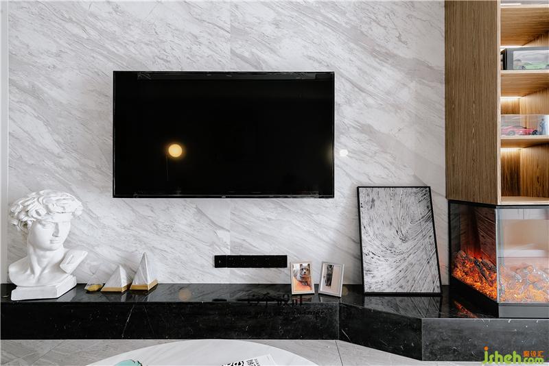 ▲墙面爵士白大理石与地面黑白根形成强烈反差,遵循墙浅地深的原则,使得空间更加沉稳。右边火红的壁炉让整个空间在沉稳宁静中又加了一丝跳跃感。室内设计师
