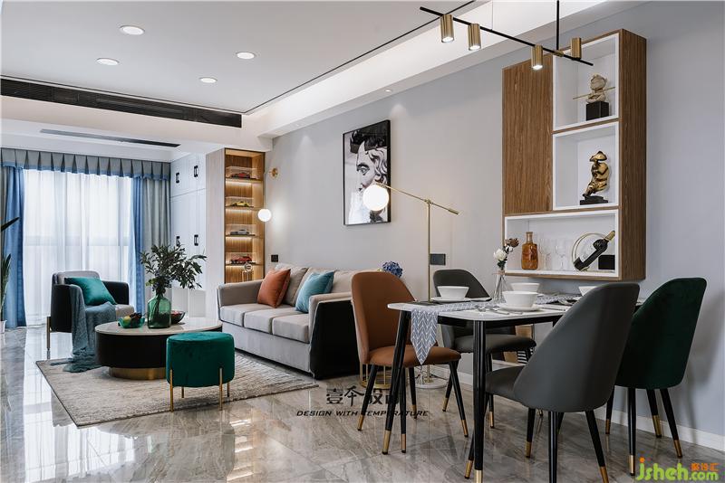 ▲南北通透的户型,以及增大厨房采光面和阳台的落地窗户,使得客厅区域采光良好,结合业主喜欢黑白灰的装修格调,电视背景采用了爵士白大理石以及沙发背景采用浅灰色乳胶漆装饰整体空间,客餐厅以灰色为主色调,加以少许的墨绿、脏粉点缀,视觉冲击力十足,整体的视觉效果非常大气且时尚。抛弃了满墙的电视储物柜,保留少许的装饰柜,并放入喜欢的手办模型,以一种简约而不简单的布局设计实现现代风格的质感,空间弥漫出一种轻松与自然感。室内设计师