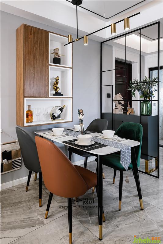 ▲餐厅,一张轻奢的大理石餐桌成为这里的焦点,在简洁时尚的外观下,将大理石与黑色的桌腿完美结合,打造出餐桌的高级质感,更加衬托出餐具器皿的精致。绒布质感的墨绿色餐椅搭配着灰色餐椅,营造出雅致、低奢的进餐氛围。室内设计师