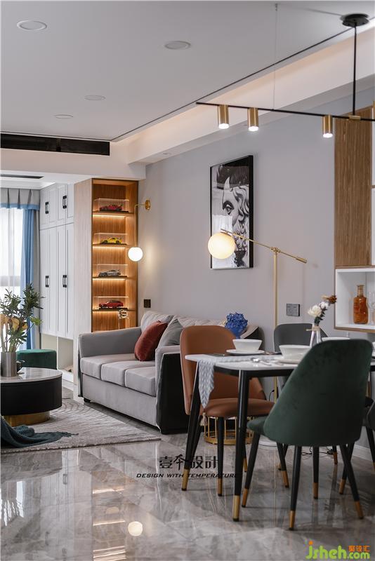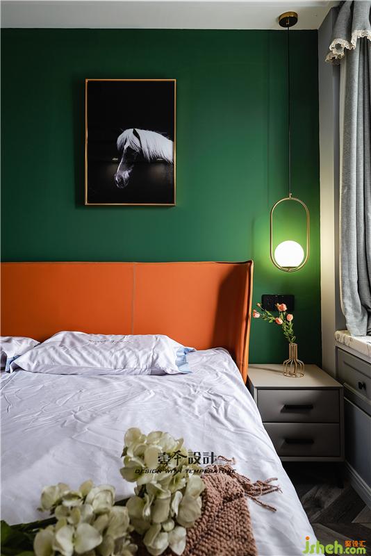 ▲主卧室床头背景的墨绿色,最近年来很受欢迎的一种颜色,墨绿色墙面搭配意式轻奢橙色,也比纯粹的绿色更加时尚。橙色的暖,墨绿的冷,恰恰平衡了整个空间。金色的壁灯又增加了空间的质感,让空间既时尚又温馨,这是设计者的巧思,更是使用者的品味。