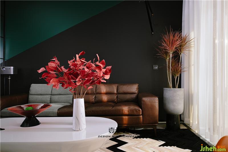 沙发背景墙巧妙的采用了分色处理,绿色乳胶漆搭配黑色的哑光木饰面,绿色的生机与活力刚好给原本沉闷的黑色增添色彩感。整个客厅充满了张力,反衬出一种别样的视觉效果。室内设计师
