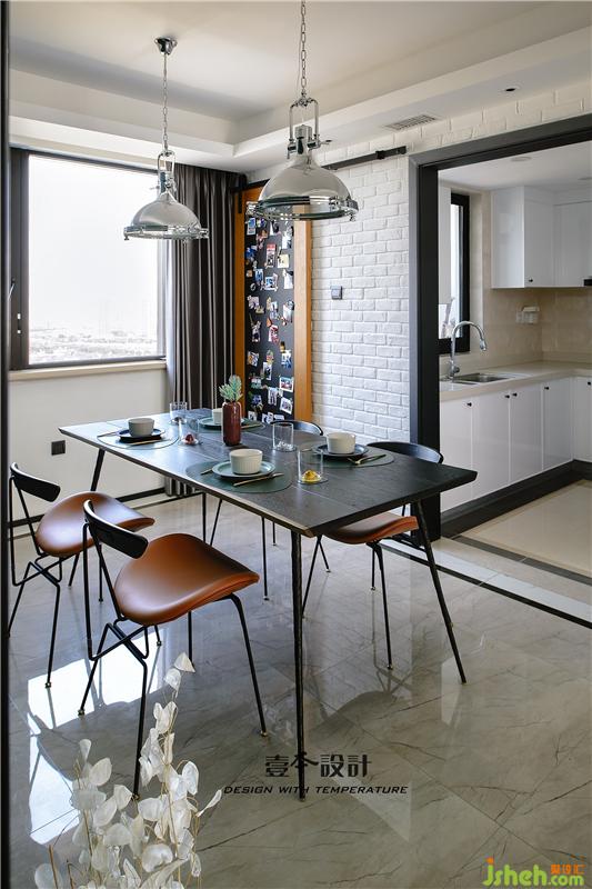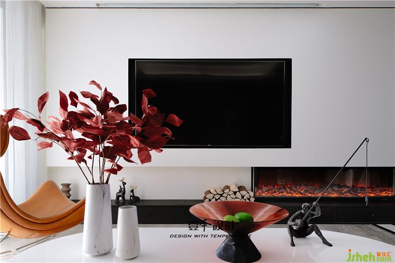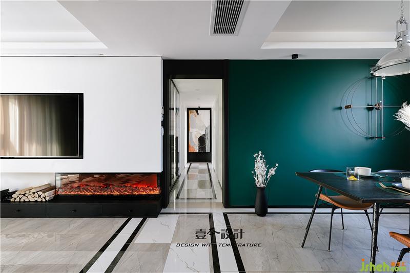 电视背景墙和餐厅背景墙一面整墙太过单一,我们设计了石膏板造型电视背景墙,下面嵌入壁炉增加了空间的灵动性。餐厅则满刷MF绿色乳胶漆,采用黑色显纹垭口门套做分隔,将客厅,过道,餐厅空间做了明显的分区。