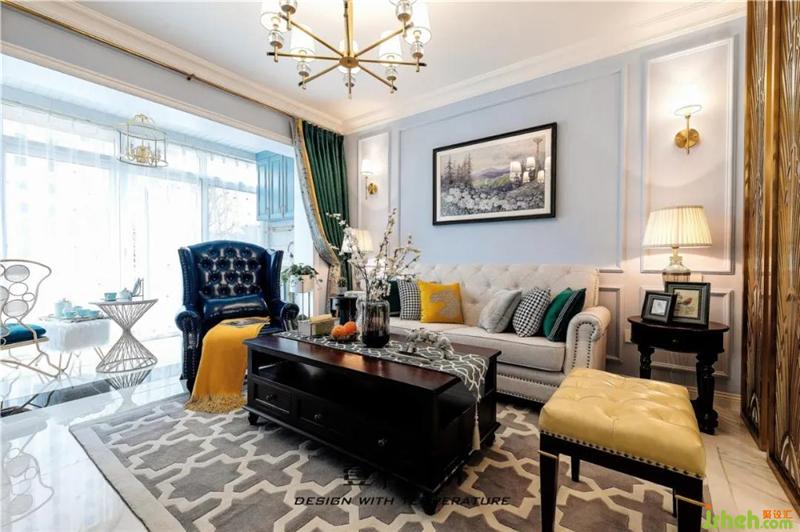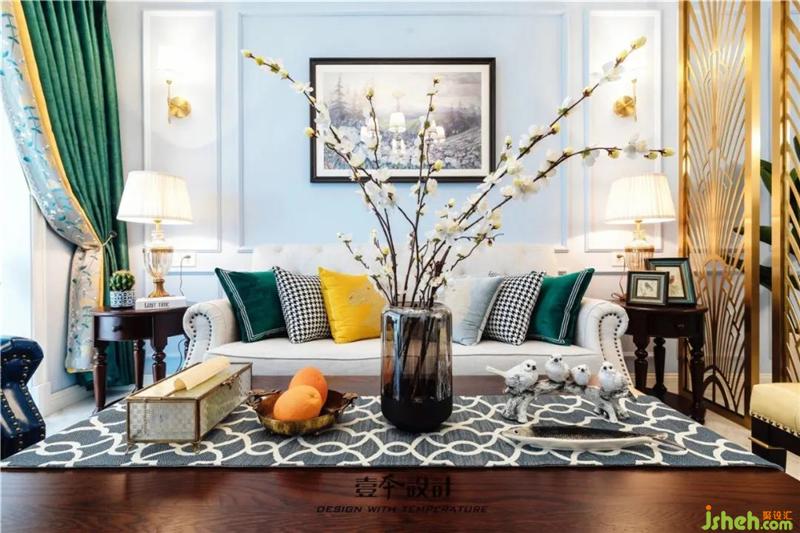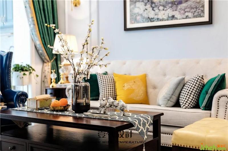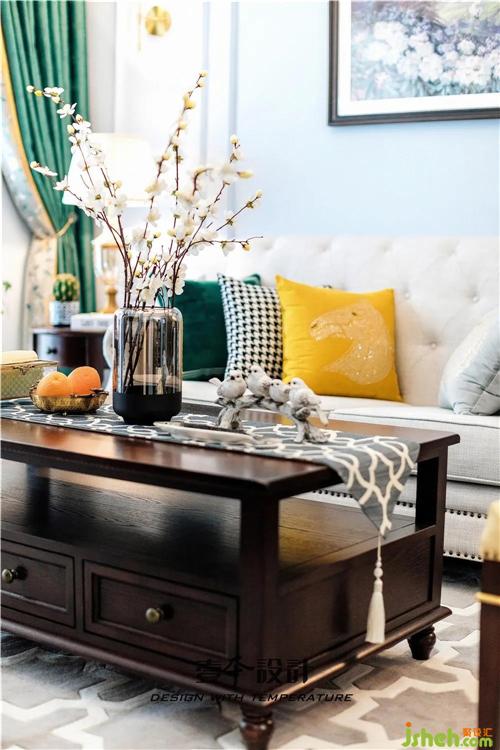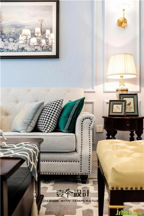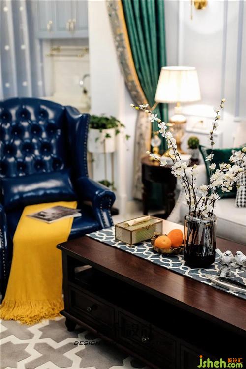 客厅仍是沿用蓝色的基调,沙发背景墙上选用了以花海为主题的装饰画,搭配美式的电视柜、茶几,显得端庄而优雅。室内设计师