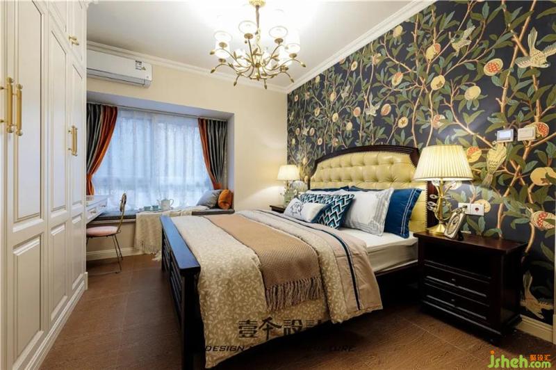 主卧床头背景墙的墙纸是石榴花纹的图案,花的枝蔓攀沿到卧室。自然、怀旧,仿佛散发着幸福的味道,营造温情与浪漫的氛围,