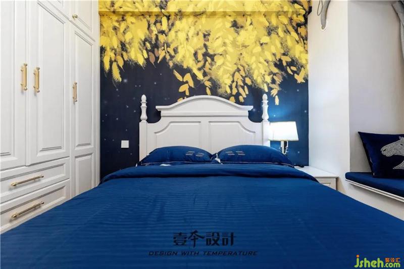 深蓝色的沉稳大气,有着令人安心的力量。金色落叶点缀着神秘的深蓝星空,让空间生动起来。