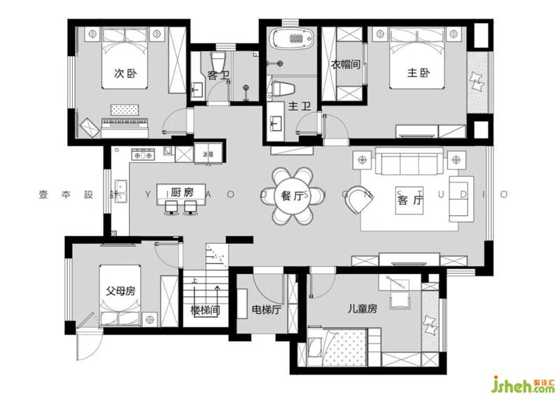 2:将餐厅调整到原来过道位置,位于整个户型的中心,采用圆型餐桌空间流动性更好。