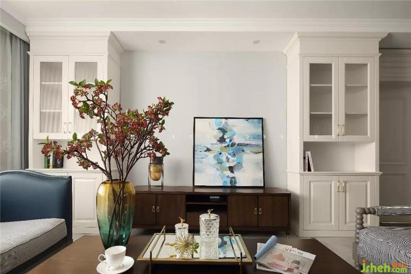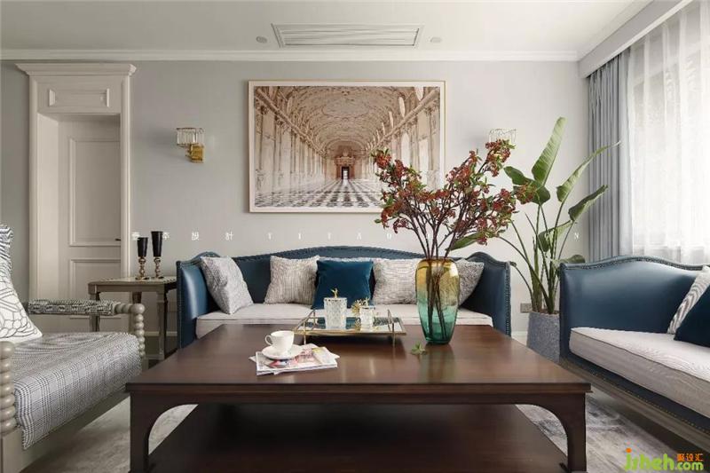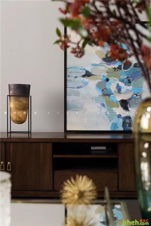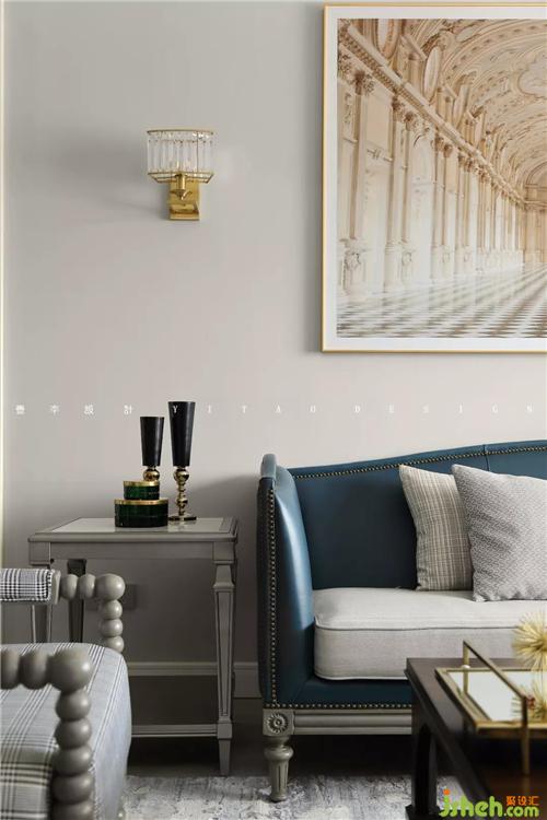 各种不同灰度的材质作为打底色,沉稳而又平和,对软装家具的色彩充满了包容性。灰蓝色的沙发是业主的最爱,增添空间色彩的同时一点也不张扬。红色的浆果作为色彩点缀非常应景,象征着累累硕果,寓意美好。