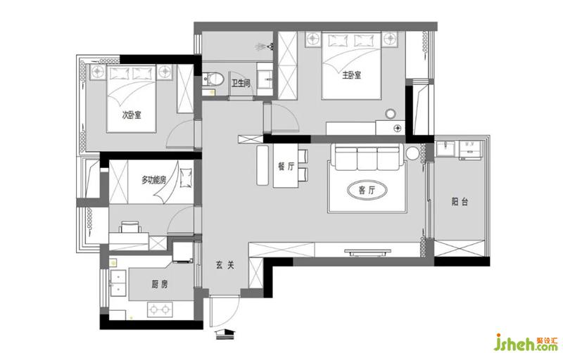 4:将主卧墙体向卫生间移动30公分,在不影响卫生间使用功能的前提下增大主卧的面积,可以轻松摆放1.8米双人床。