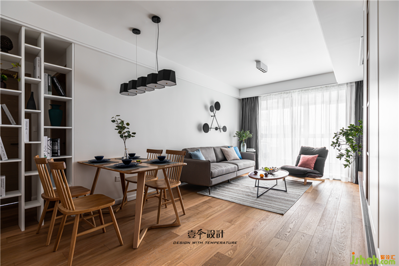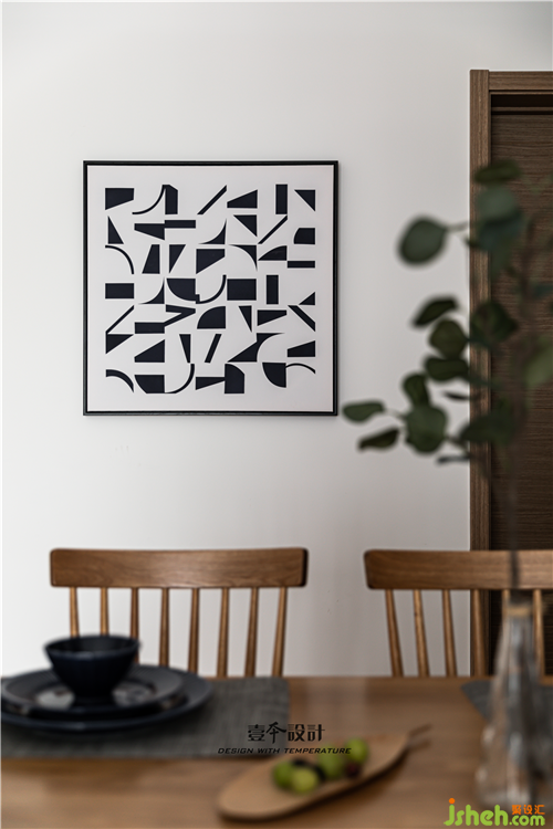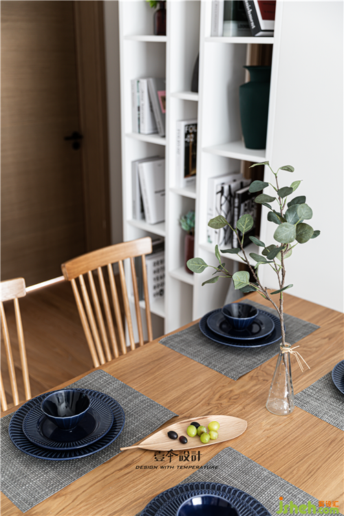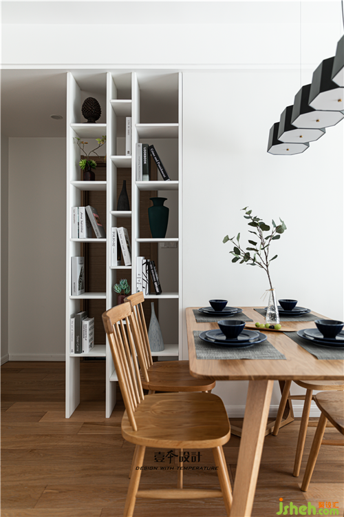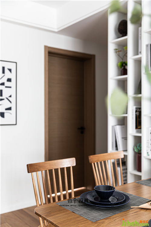 餐厅设置开放格柜,虚虚实实,避免餐厅直面卫生间门的尴尬同时延展空间感。实木餐桌椅的温润木质和灰白墙面的搭配,清爽干净,质朴无华。南京室内设计师