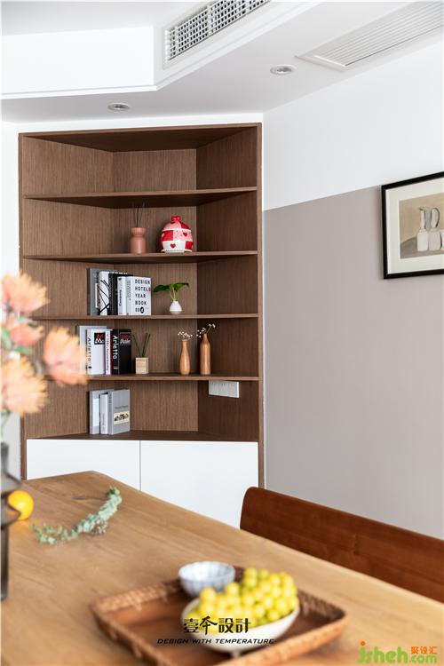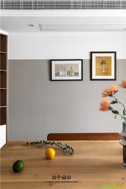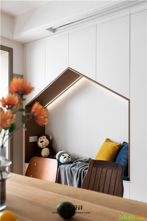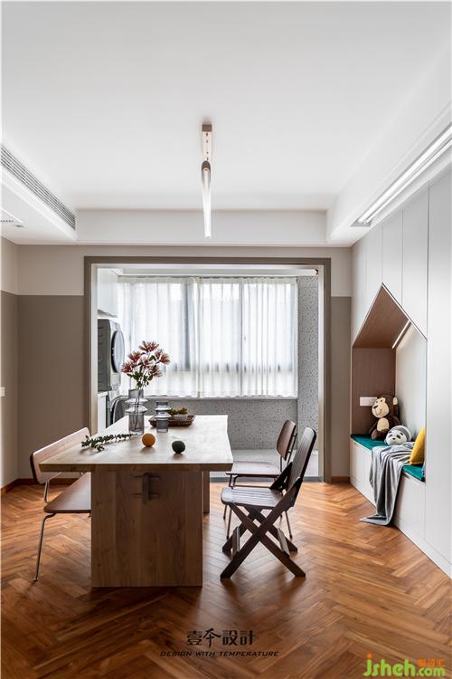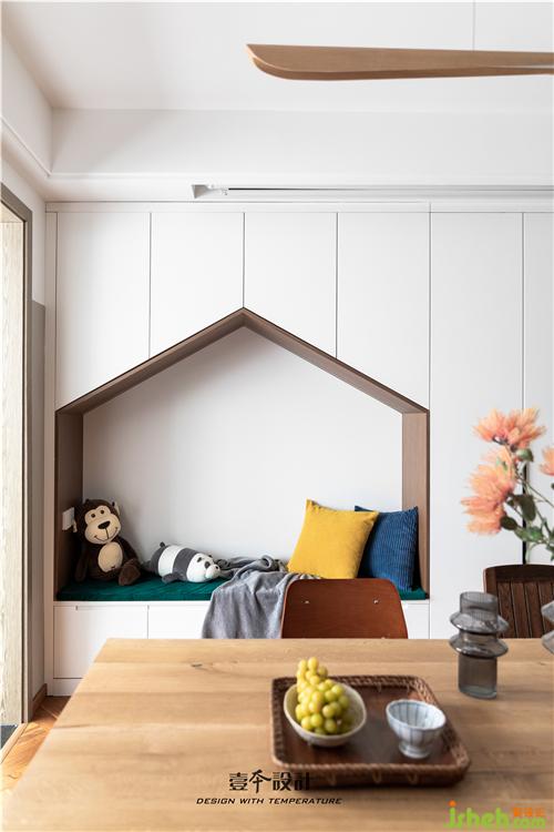 客厅室内设计师没有按常规布置沙发和电视,而是放置一张实木大桌。在这张桌子上,阳老师可以陪伴孩子学习、画画、做游戏,让亲子关系更加和谐。父母在桌上办公时,孩子也可以在我们为他们打造的树洞里看书玩耍。