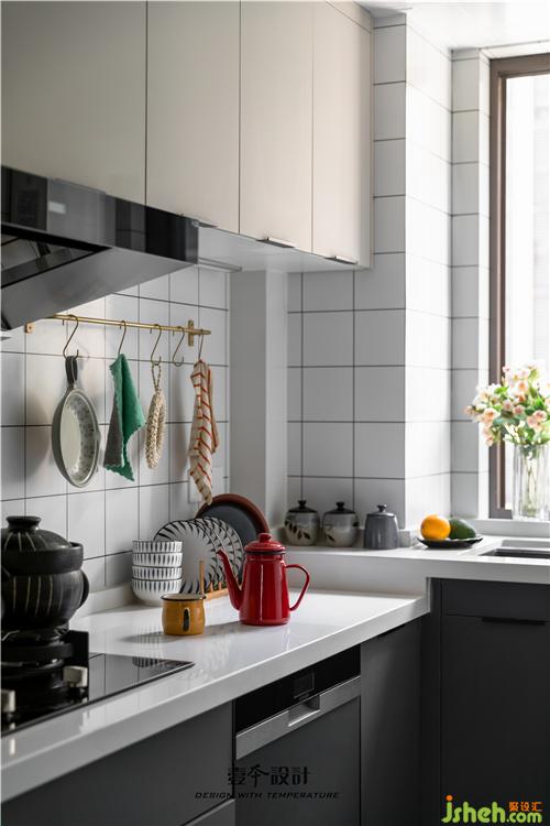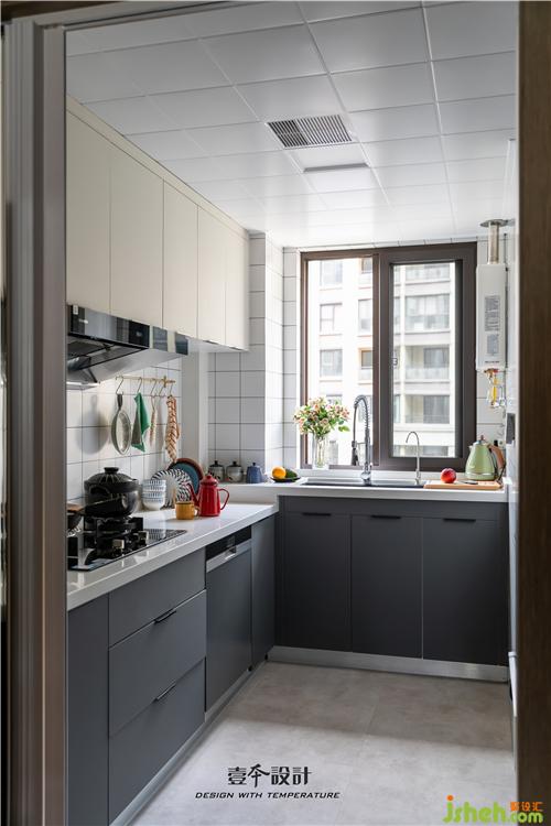 厨房整个系列是灰色调,雅致中带着冷静,让厨房的视觉效果达到平衡舒适的地步。由于阳老师身材高挑,所以室内设计师特意定制了符合她身高的厨房水槽台面,便于日常使用。