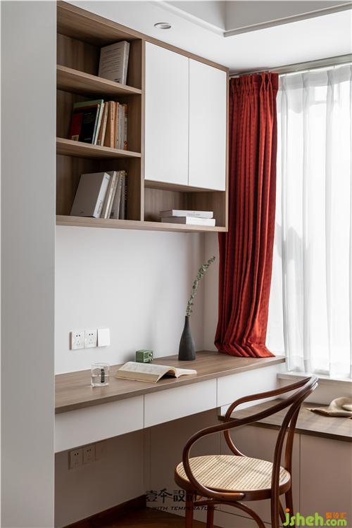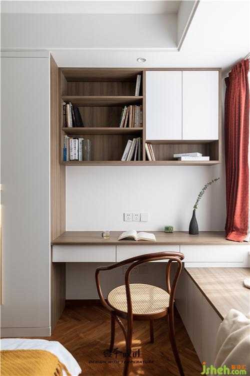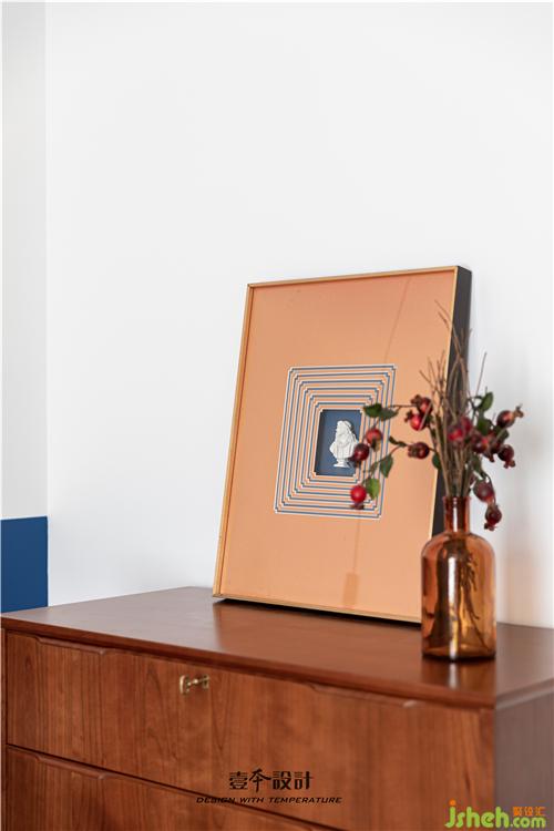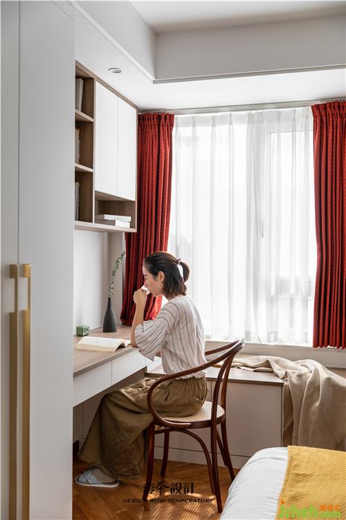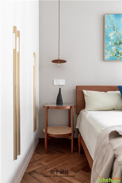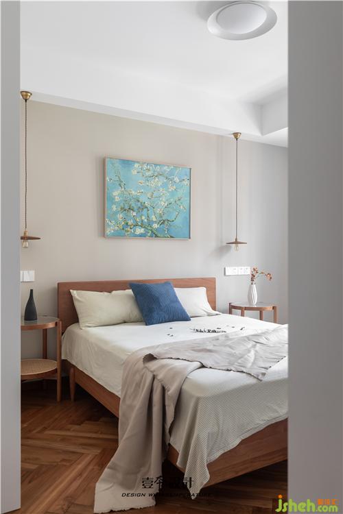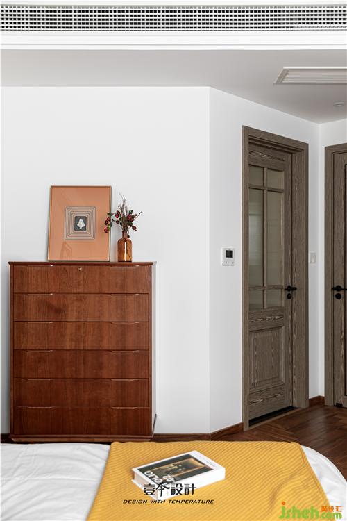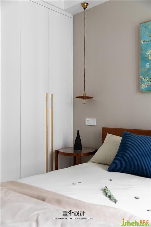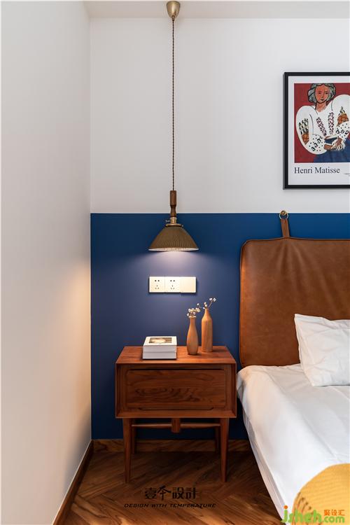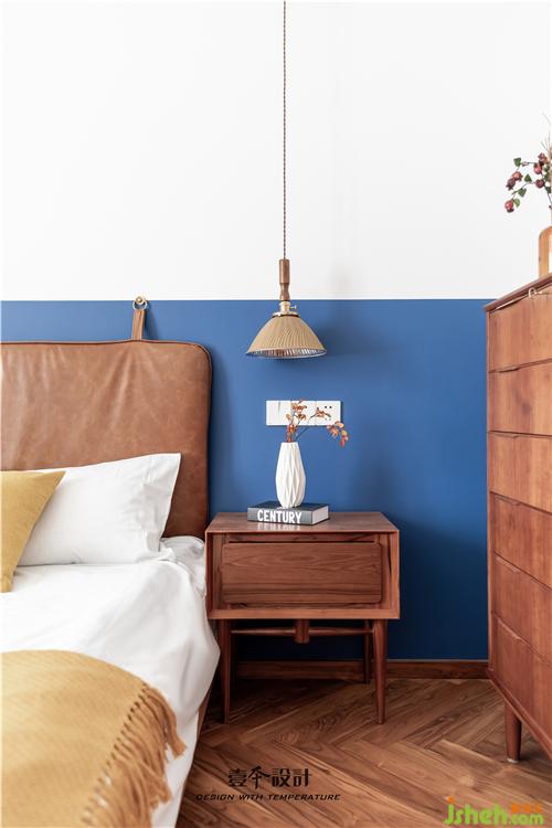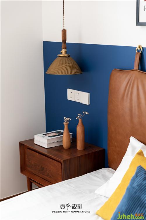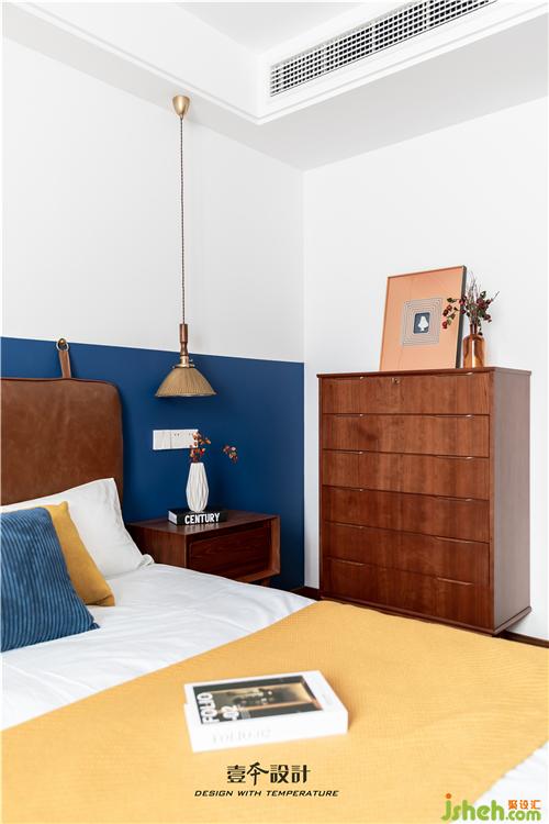 主卧蓝色背景和黄色抱枕的结合,使空间看起来不枯燥,能够感受到活泼新鲜感。牛皮靠背的真皮床,简约中融合了品质、艺术与功能实用。衣柜旁还有一处休闲区,休闲舒适的氛围不失空间的功能性与沉稳感,光影交错,在飘窗上洒下一米阳光。