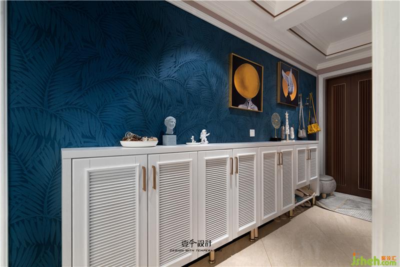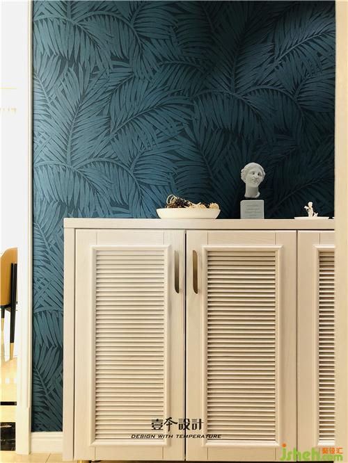 进门右手墙面比较长,为降低视觉上的冲击力,室内设计师做了一组鞋柜,进门将包包等物品挂在金属挂钩上,坐在换鞋凳把鞋换下,底部悬空便于收纳常用拖鞋,百叶门鞋柜搭配金属把手,简洁大方。
