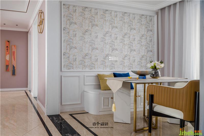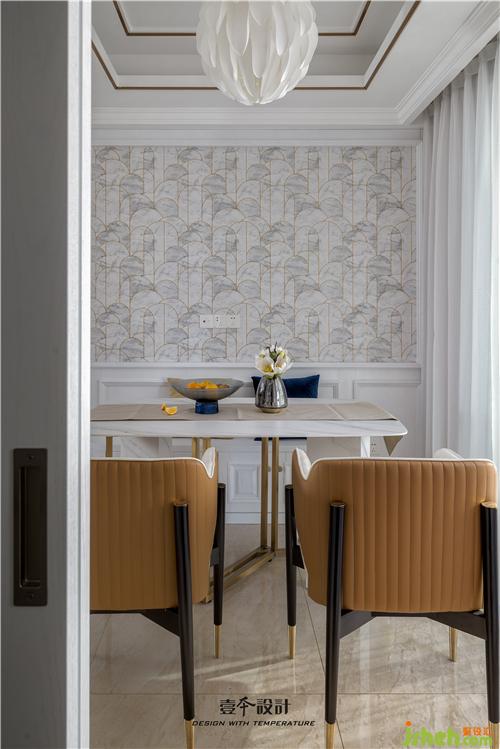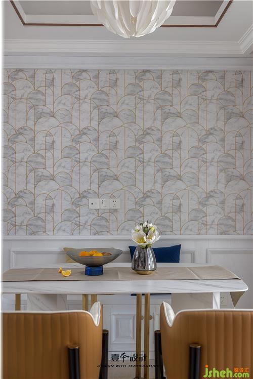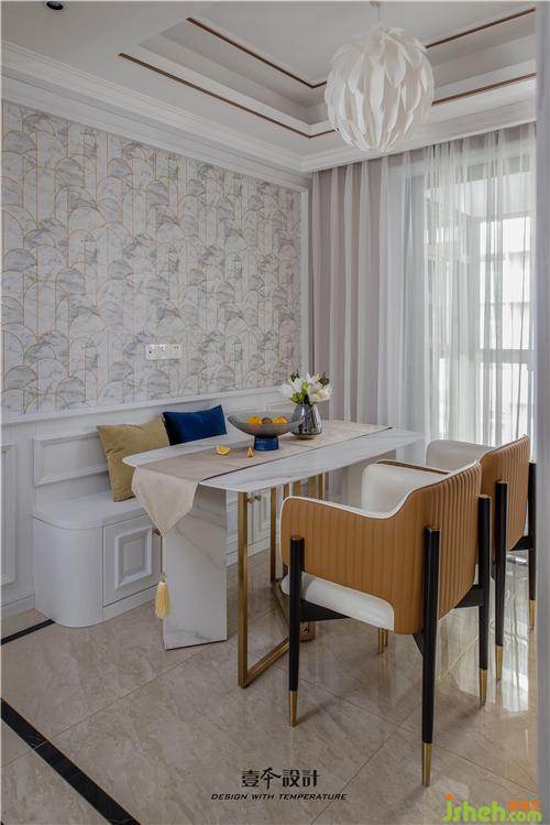 卡座餐厅时尚又实用,卡座下面可以做储藏柜,上面放上抱枕,温馨感瞬间提升。轻奢精致的餐桌椅,室内设计师在金属、石材与皮艺质感的结合搭配下,呈现出有仪式感的用餐氛围。