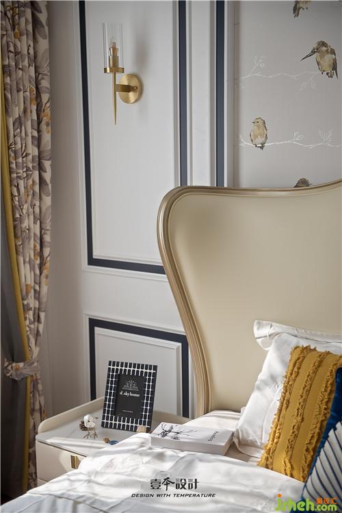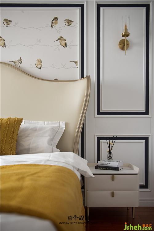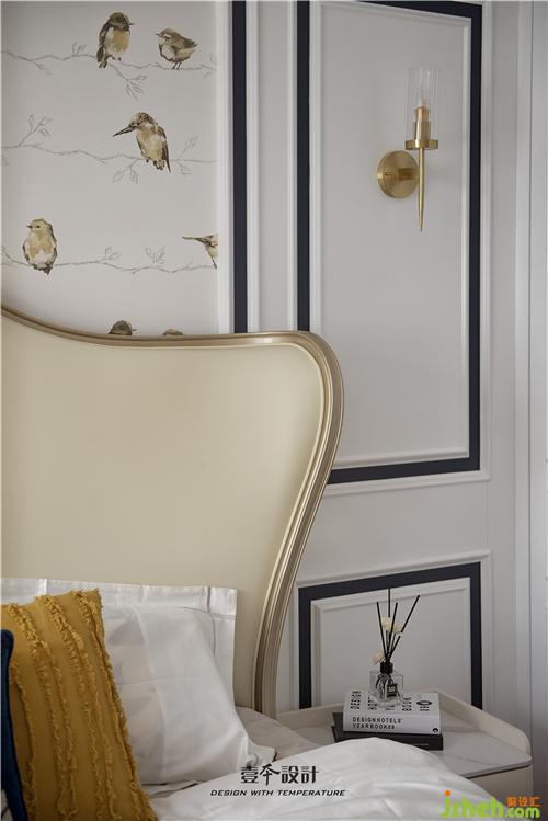 卧室延续客厅风格,室内设计师在顶面加了金属线条,米色的皮艺床,精致的壁灯,整体搭配也让卧室显得干净优雅。
