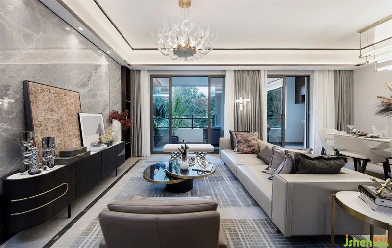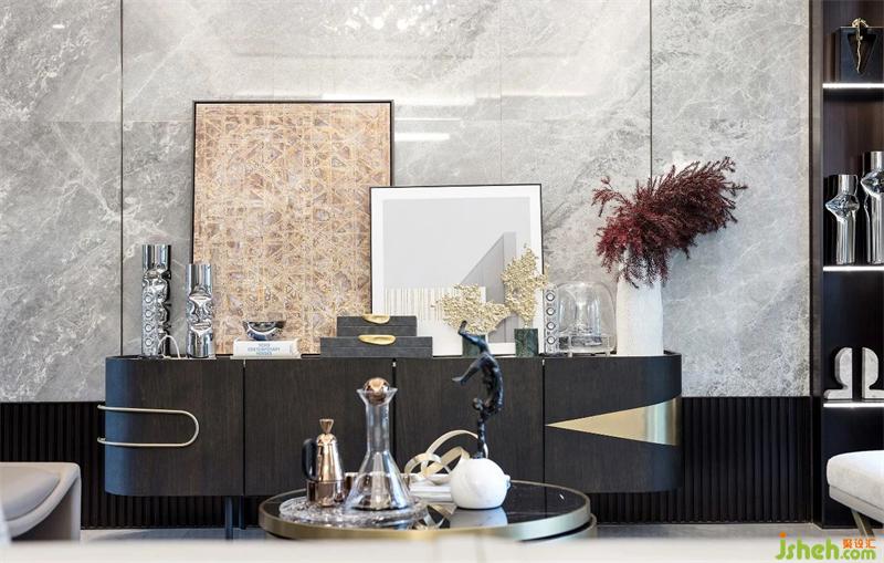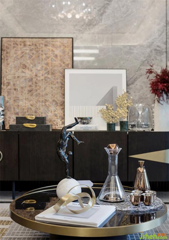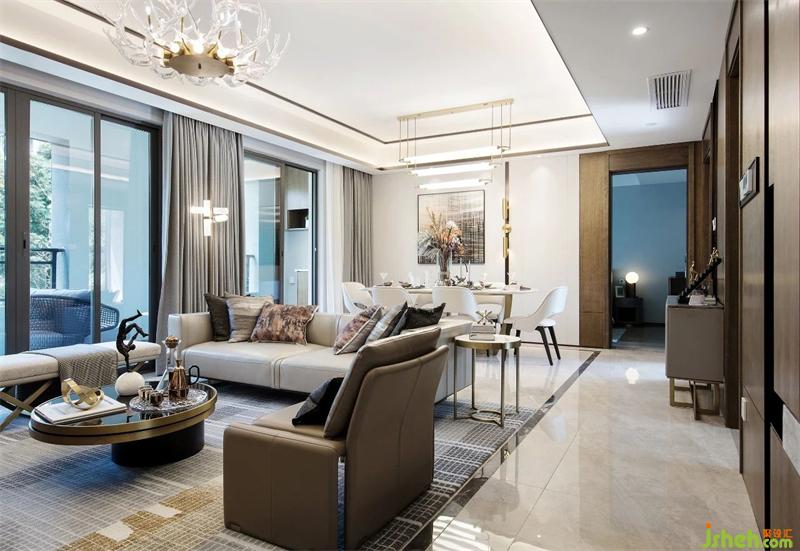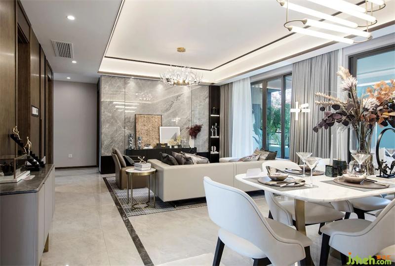 武汉样板房设计造型与细节低调地诠释出对生活的热爱。线面结合的天花有妙不可言的灵动感,自然肌理的大理石墙面;精致的黄铜烤漆茶几、纹理丰富的地毯、绅士品格的皮革沙发与空间相互呼应,增添生活仪式感。