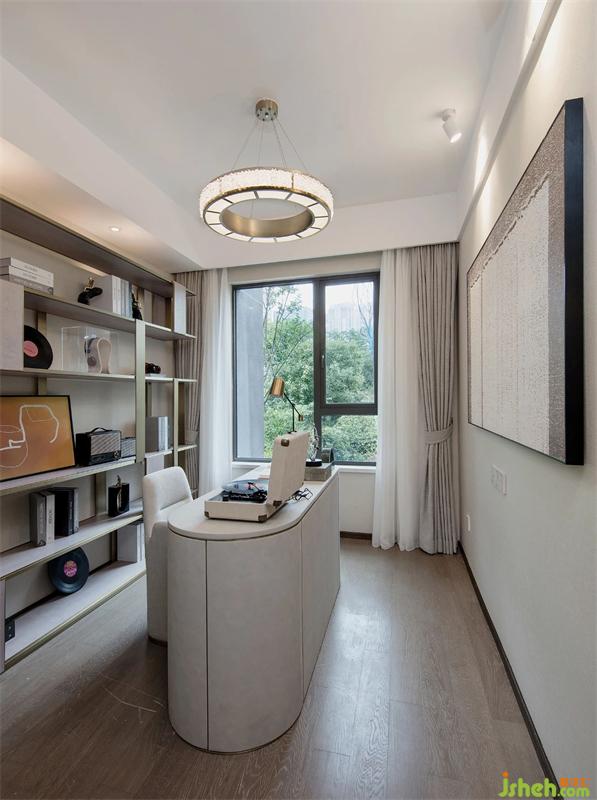 “材料的穿插,让生活的品质感与舒适性娓娓道来。”家具的搭配与墙面相互协调、水晶吊灯以及金属元素的点缀,成就了书房一隅的阅读时光。每一处设计的细节都有其特色存在,创造出一种轻松、随意的生活状态。