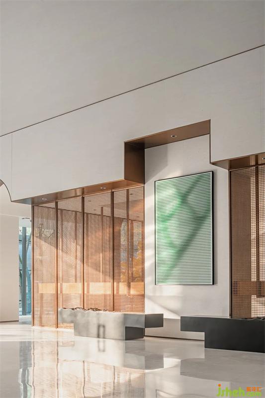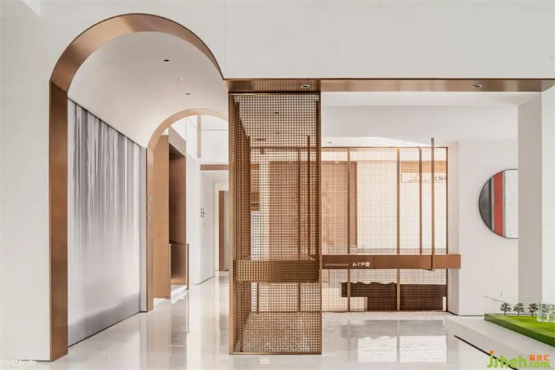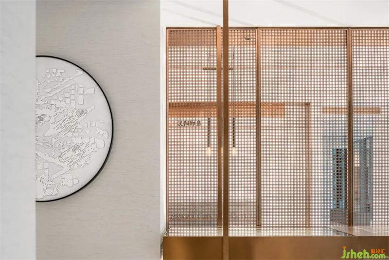 中国传统木构建筑中,窗棂是最重要的构成要素之一。于此汲取灵感,通过迭加、错落有致的组合,形成接待大厅与沙盘区的分界格栅,作为空间呈现的设计元素,让走进其间的人们体验到一种观感的愉悦和探究文化痕迹的乐趣。